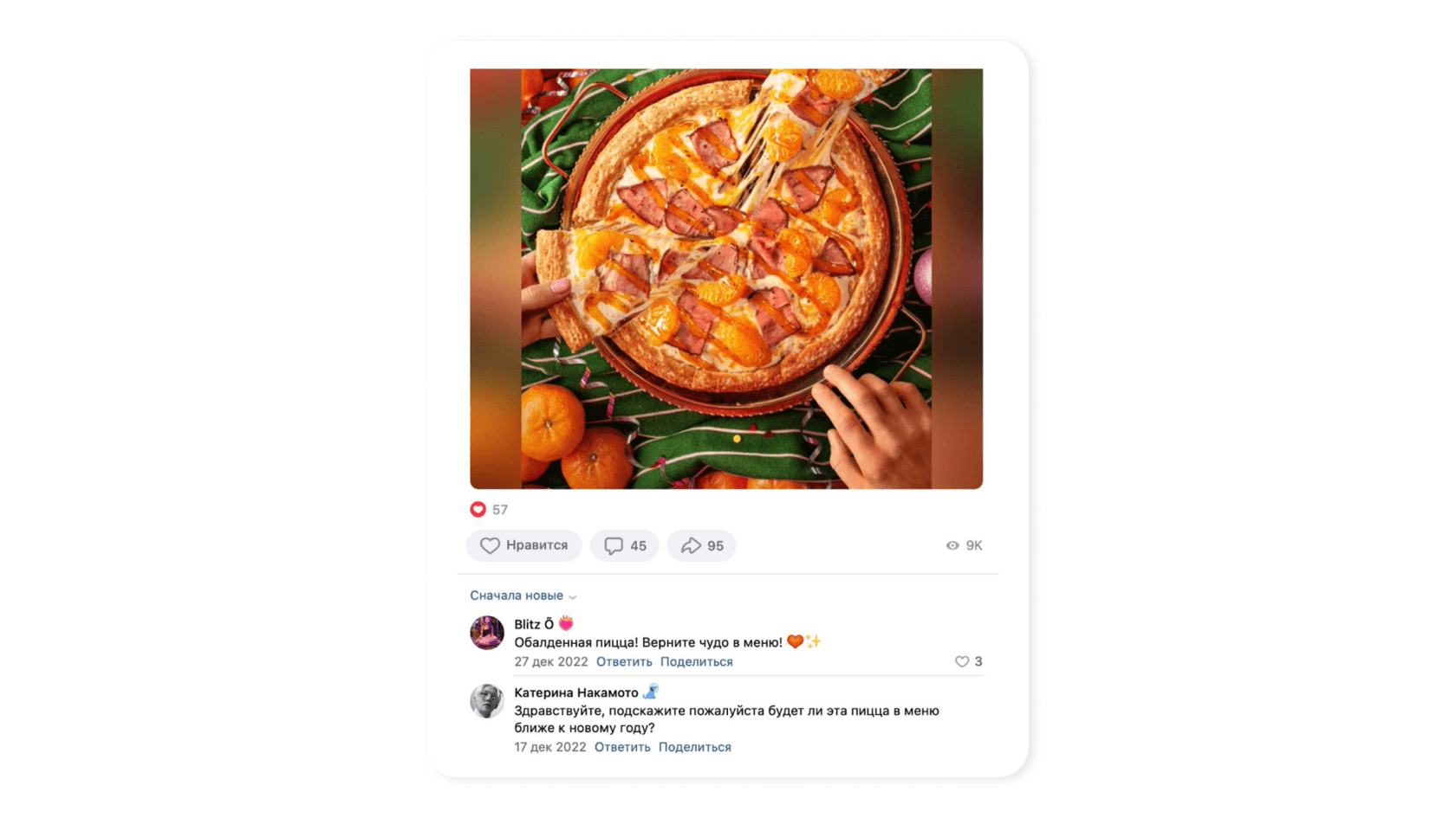 Пост про пиццу с мандаринами на странице сообщества Додо