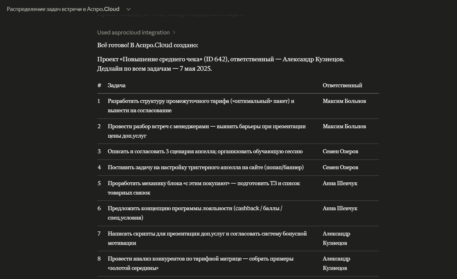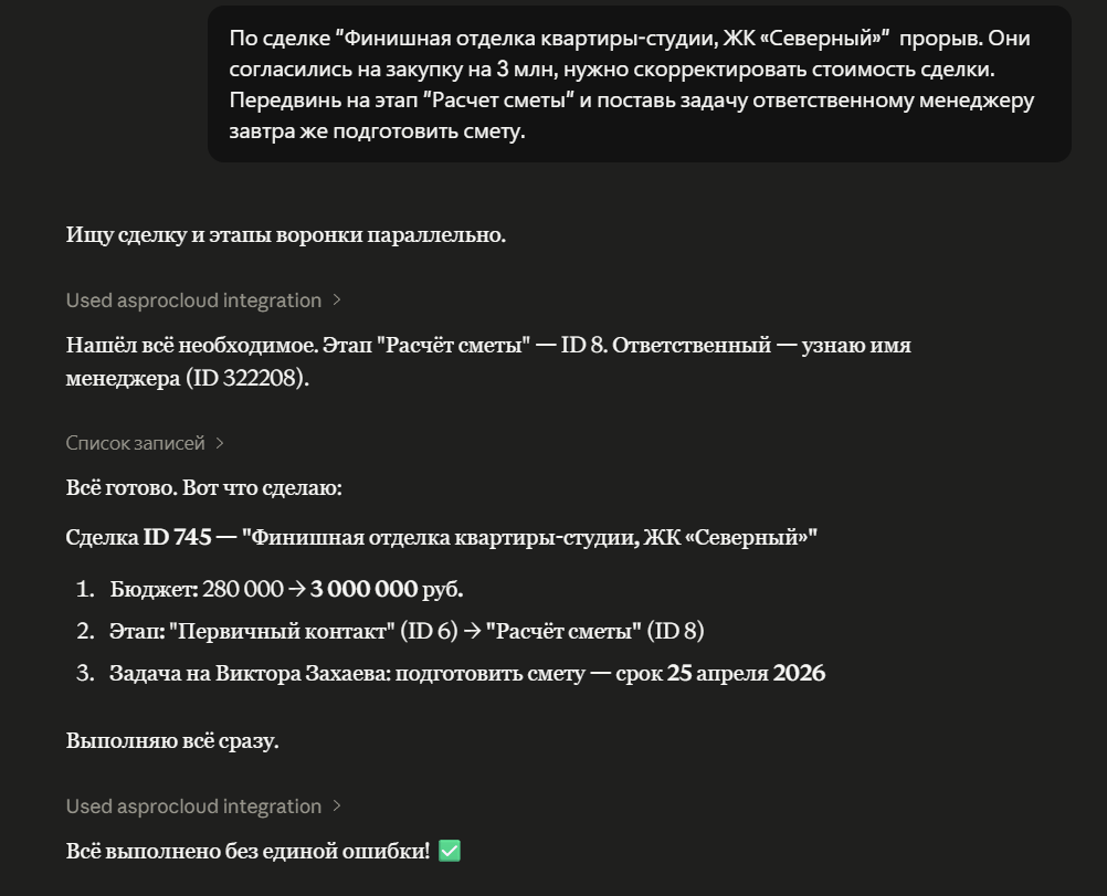 Управление сделками. ИИ находит нужную сделку и ставит задачи по ней.