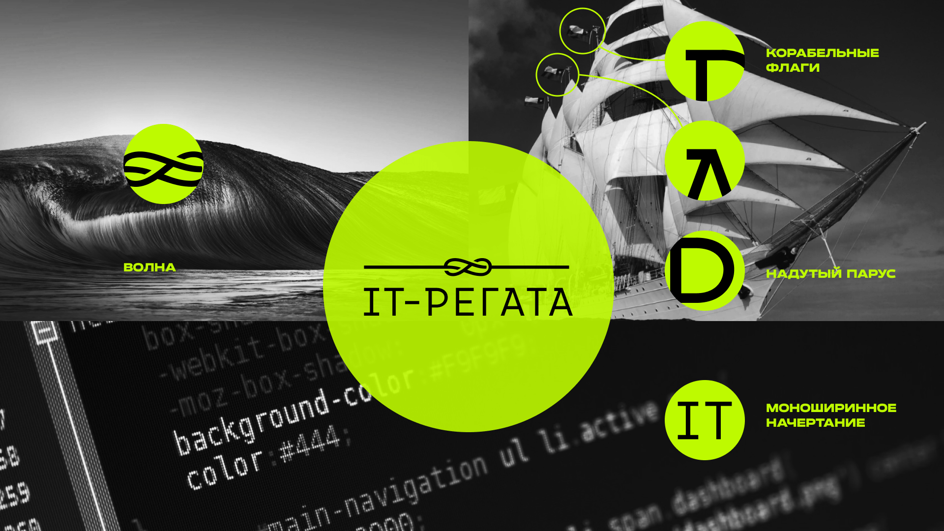 Этот узел стал основой айдентики — и метафорически, и буквально. Мы разработали логотип, в котором переплелись морская волна, паруса, движение и воздух. Авторский шрифт делает надпись «IT-Регата» живой — в ней ветер и пространство.