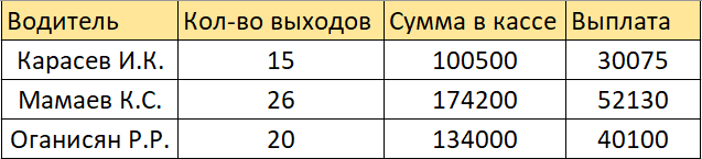 ЗП водителя: МРОТ + (1000₽ * КОЛ-ВО ВЫХОДОВ НА ЛИНИЮ В МЕСЯЦ) + (20% ОТ УСПЕШНЫХ СДЕЛОК)