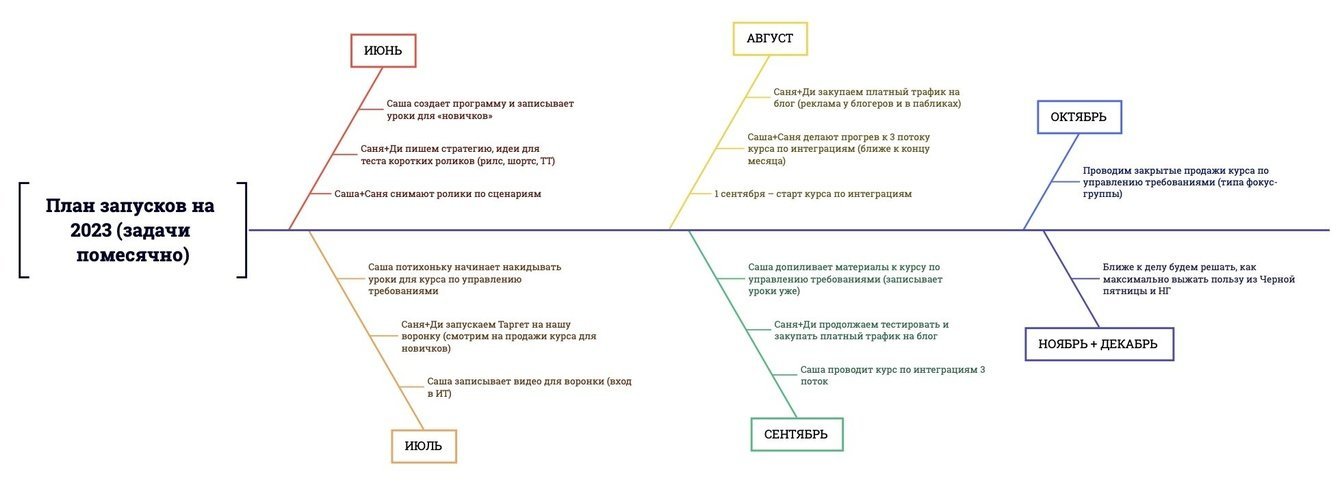 Ну и какая стратегия без плана? С начала и каждые полгода мы готовили для команды и Александра декомпозицию SMM-продвижения, фиксируя ключевые задачи и ответственных за них помесячно.