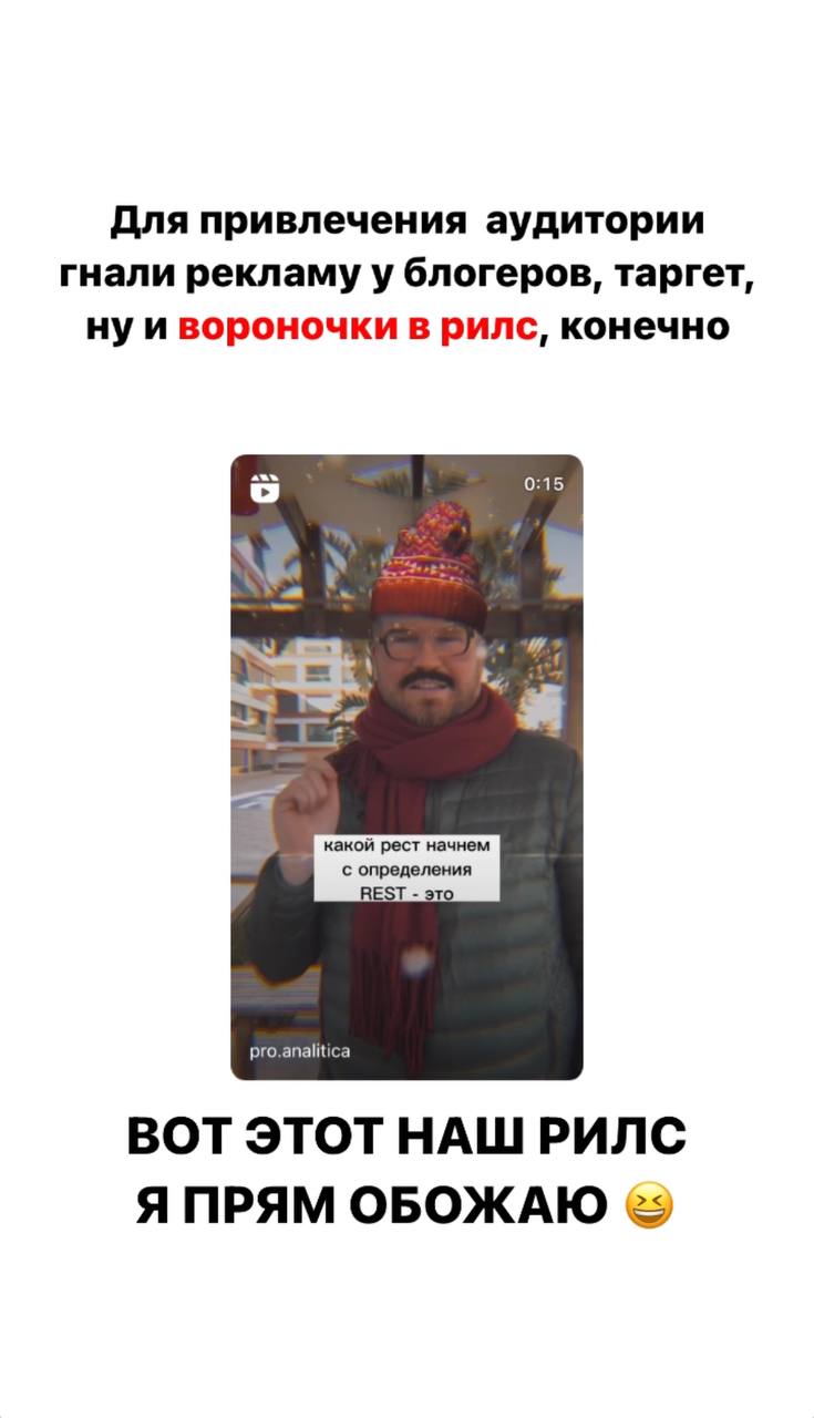 · собственно выкладки контента - посты, вертикальные ролики, сторис (в сотрудничестве с маркетологом Александра)