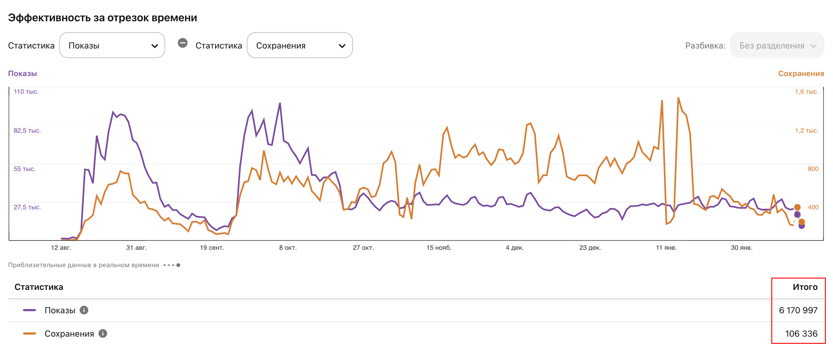 Помимо охвата, поддерживали пропорциональное вовлечение аудитории — пины охотно сохраняли. А это один из важнейших показателей для площадки — чем больше сохранений, тем больше пины показывают в ленте другим пользователям.