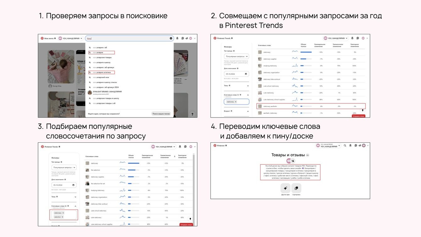Ещё хорошо работают ключевые фразы — словосочетания, по которым пользователи ищут референсы внутри платформы. Мы открыли Pinterest Trends, выбрали самые популярные запросы по канцелярии и рабочему столу за год и затем перевели их на русский язык.