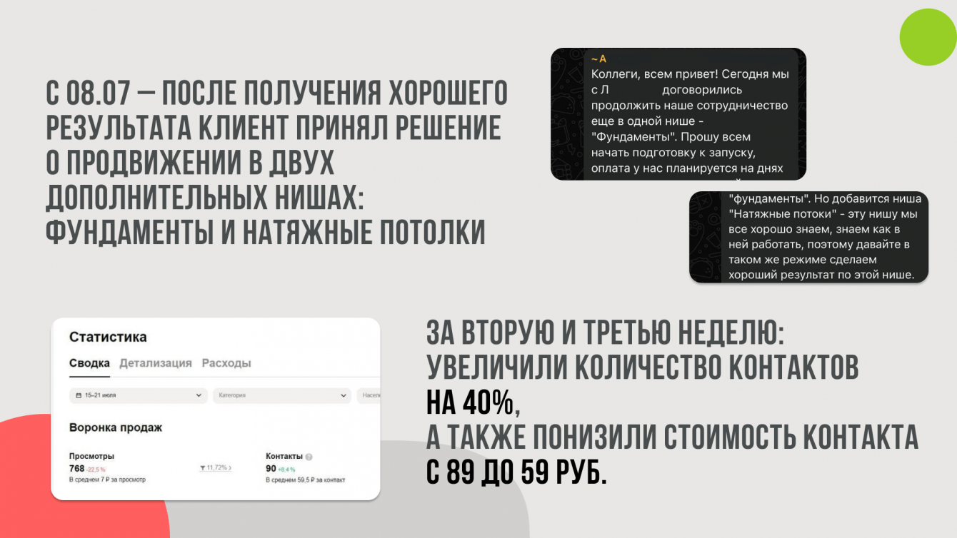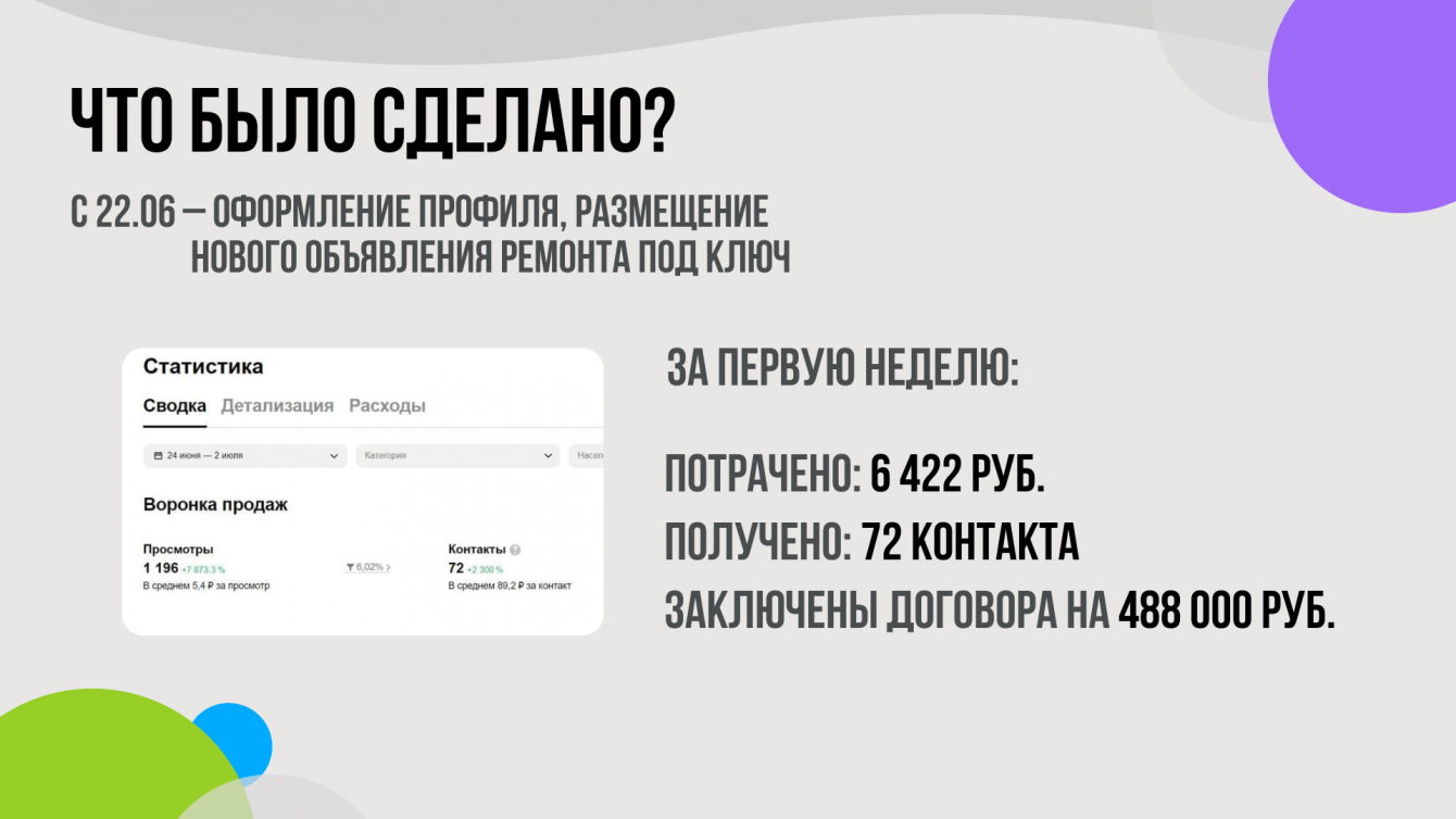 За первую неделю мы вышли на стоимость 89 рублей за контакт и получили 1196 просмотров. Были заключены договора на 368000 и 120000 рублей.