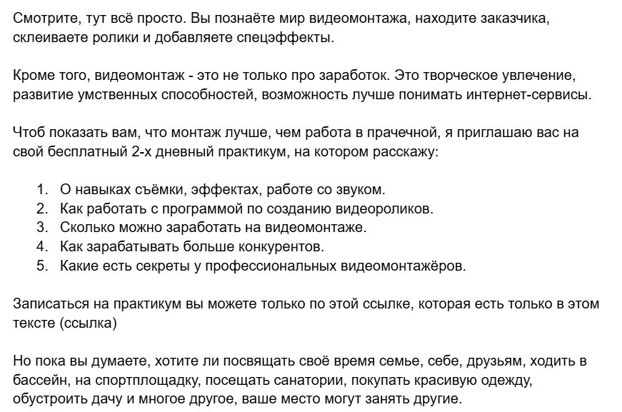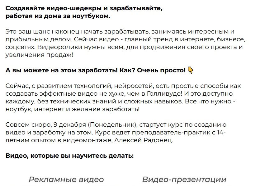 Мы не стали совсем отказываться от «молодого» сегмента. Продолжаем понемногу тестировать разные подходы. Но пока хороших результатов нет.У нас есть гипотеза, почему так происходит. Подача эксперта — очень спокойная и монотонная, его слушают пенсионеры, а молодёжь — нет.Чтобы решить эту проблему, планируют найти более молодого и активного спикера, записать с ним вебинар и потом курс. Тестируем много посадочных страниц.Повторюсь, когда в команде онлайн-школы — люди, которые хотят работать, они начинают делать тесты.За последние 2 месяца мы протестили 3 подписные страницы в разных форматах.Первый — текстовый.