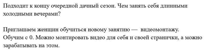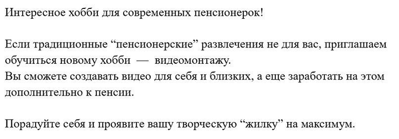 В инфобизнесе клиент живёт полгода? Ну, не знаю, мы с проектом по видеомонтажу работаем третий год. Хотя согласен — на рынке есть куча историй, когда подрядчиков меняют уже через полгода, либо что-то ломается в самой школе.В этой школе меняются трафик-менеджеры, мы — остаёмся :)Когда мы начинали работать, трафик-менеджер там был давнишний, со своими наработками и видением всей ситуации.Он выдал нам примеры ЦА и сказал начинать работу. Описание её было примерно такое: «люди 25-45 лет, которые хотят научиться делать клипы и сторис и зарабатывать на этом».Конечно, мы начали запускаться на предложенную ЦА и оффер. Мы приводили лиды для онлайн-школы, укладываясь в KPI 250 рублей, но окупаемости не было. Если падал один заказ — это был праздник.Оказалось, что такая фигня не только с нами. У всех подрядчиков до нас была такая же проблема с окупаемостью. Здесь пробовали себя и крупные трафинговые агентства, и фрилансеры, результат — один.Проводили мозгоштурмы, проект разбирали по косточкам, тестили идеи с сайтом и т.д. — всё не то.Что ж, вызов принят. Мы решили провести тесты на аудиторию 45-50+. И получили первые оплаты.Через несколько месяцев работы, зимой 2022 года, мы провели анализ старых запусков, собрались на мозгоштурм с заказчиком и подумали: зачем лить всё на аудиторию 25-45 лет, если можно взять 50+?Это был канун Нового года. Мы приняли коллективное решение и предложили пенсионерам не заработок, а идею о том, чтобы они перестать искать открытки в WhatsApp и Одноклассниках, а делали их сами.Оффер был не про доход, а с посылом: «Ты будешь развивать мозги вместо того, чтобы смотреть телевизор, радовать близких, детей, внуков и создавать классную семейную атмосферу».И это зашло.