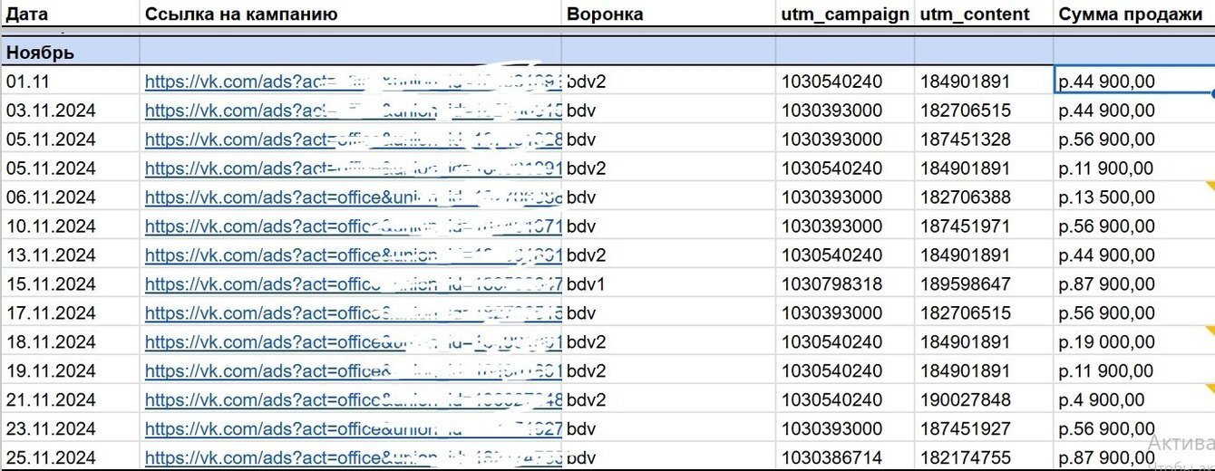 В ноябре трафик из ВКонтакте окупился х2 — заказов получили почти на 1 млн, продали на 600 тысяч.Мы ведём статистику продаж по каждой воронке. Можем посмотреть, какой человек с какого рекламного объявления купил — эти данные у заказчика или трафик-менеджера в любой момент под рукой.