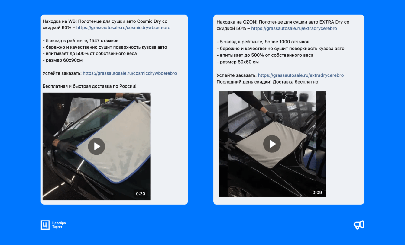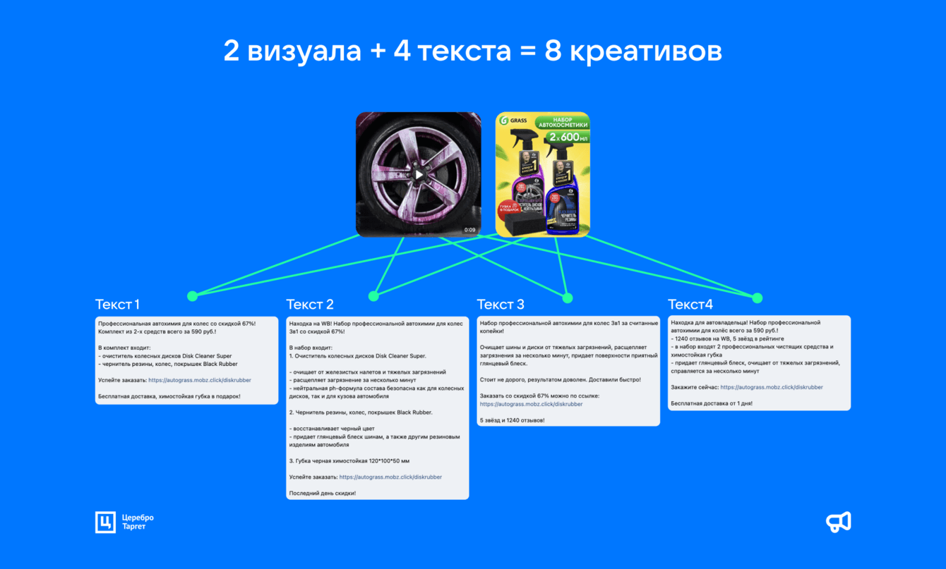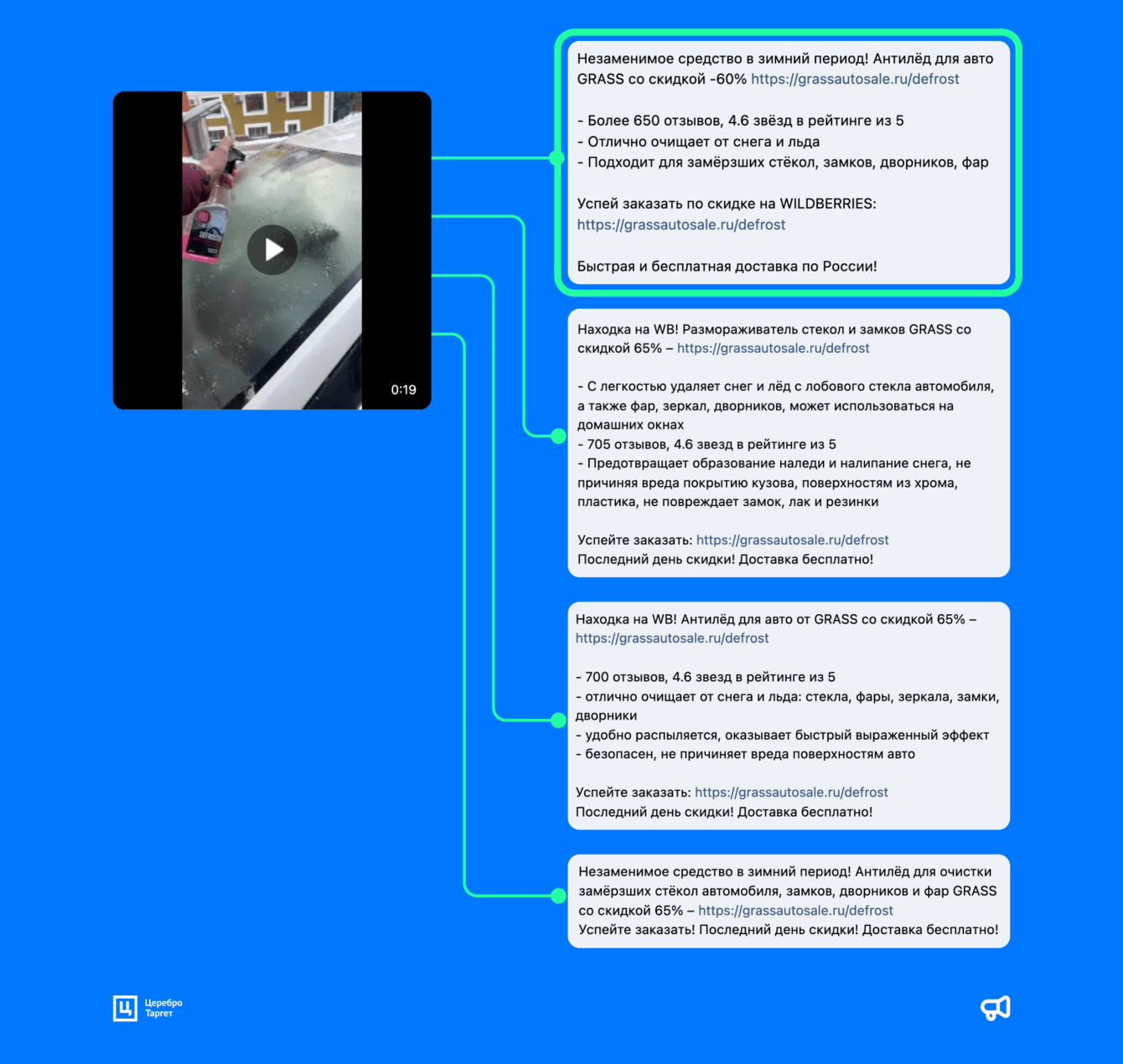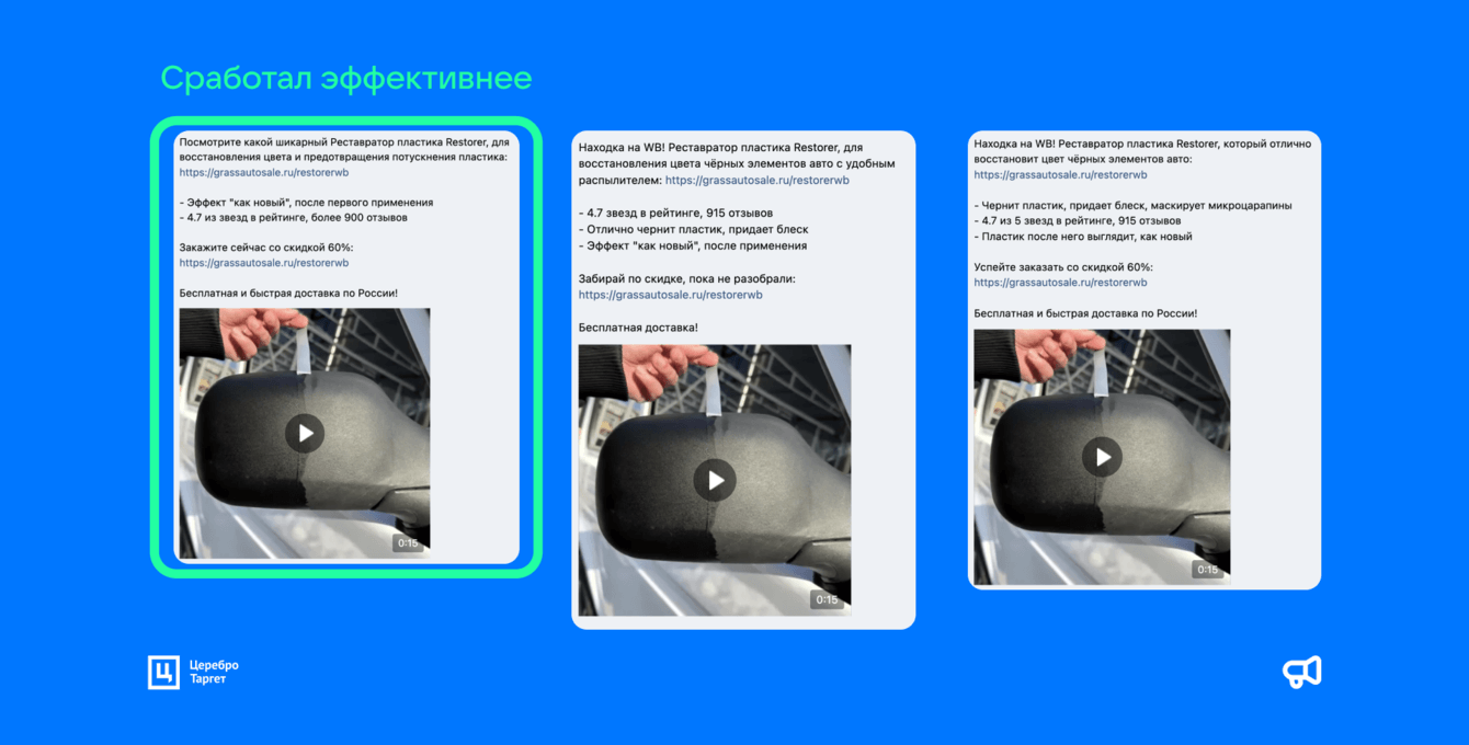 Сначала протестировали 4 текста с видео, где средство распыляют на лобовое стекло под музыку. Цель — определить наиболее эффективный текст. Им оказался 1 вариант.