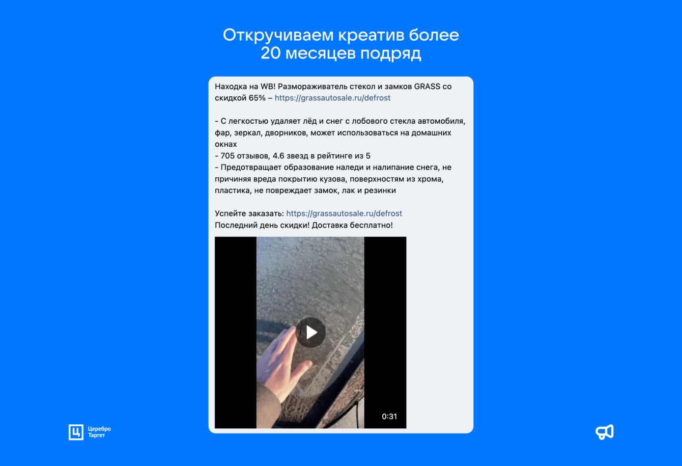 Подборка фаворитов началась с антиржавчины, о которой писали выше. И что интересно, для этого товара мы откручивали один и тот же креатив, который не выгорал более 1,5 лет. Единственный эксперимент: запускали тот же текст с другим видео, но в итоге вернулись к прежнему варианту.