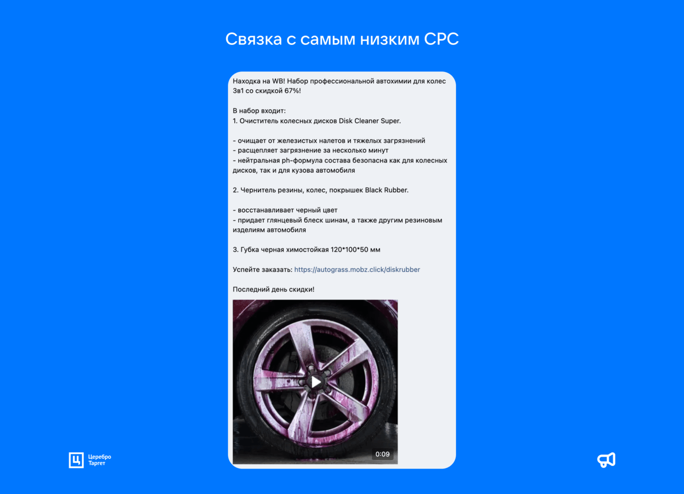 В августе запустили на тест второй товар — средство-антиржавчину. За 5 дней протестировали 7 креативов по тому же принципу, что описали выше. Общая цена клика за период получилась почти копеечной.