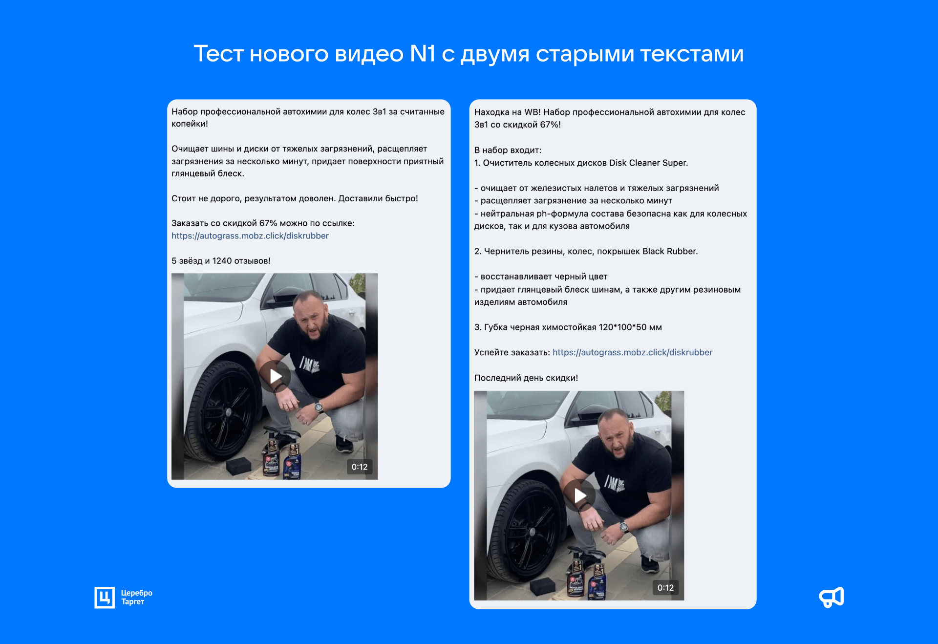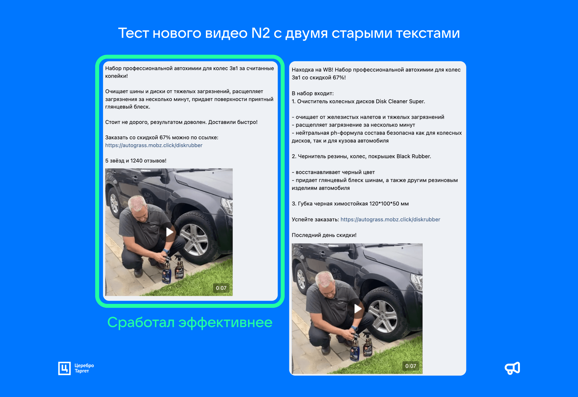 Сначала протестировали 4 текста с видео, где средство распыляют на лобовое стекло под музыку. Цель — определить наиболее эффективный текст. Им оказался 1 вариант.