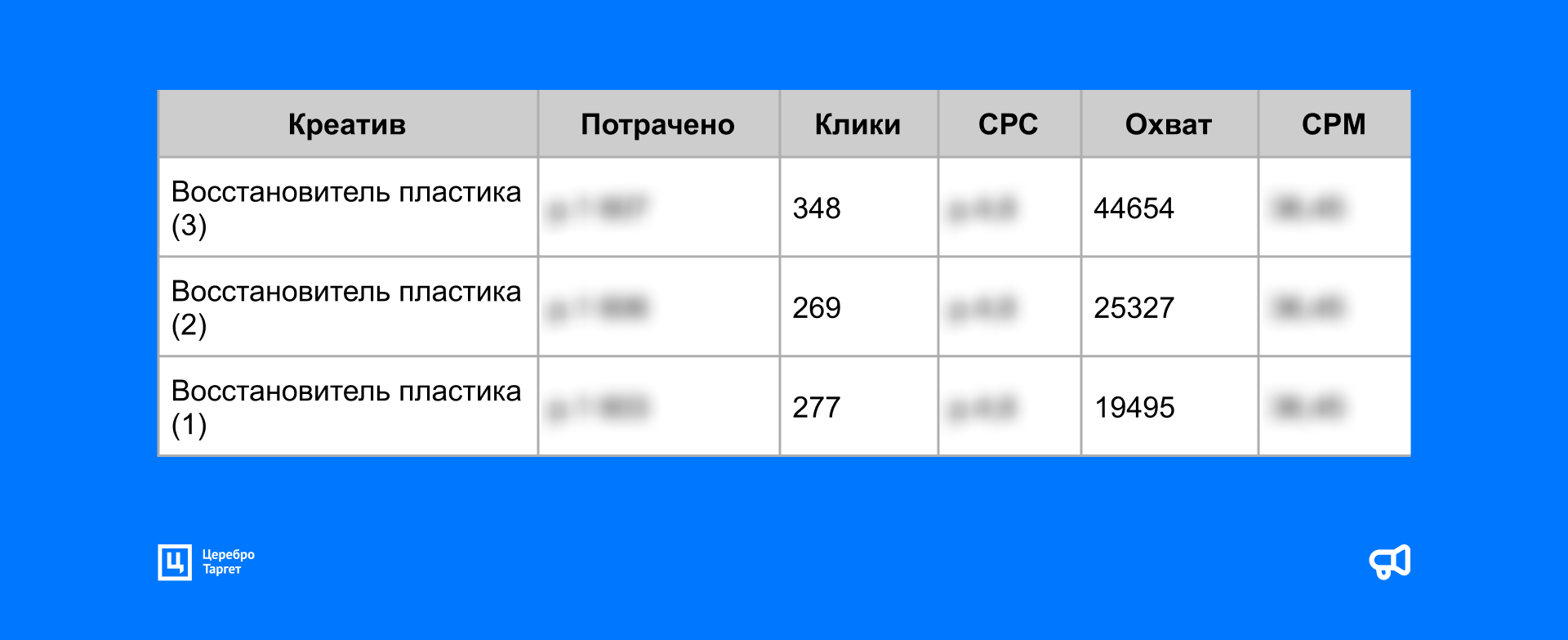 Тексты плюс-минус похожие и дали одинаково дешевый CPC, однако более значимая разница была в CPM. Остановились на самом дешевом.