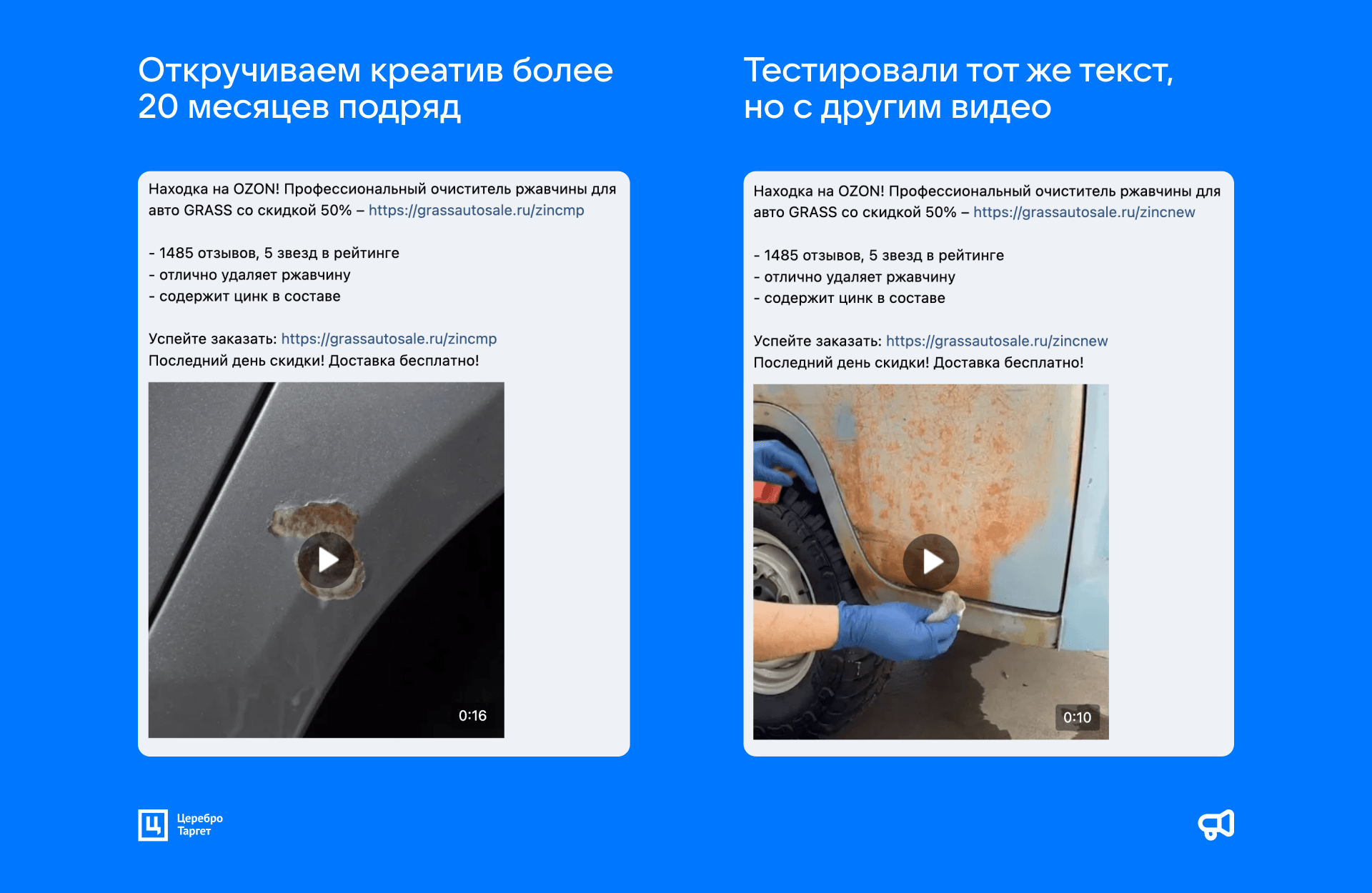 Подборка фаворитов началась с антиржавчины, о которой писали выше. И что интересно, для этого товара мы откручивали один и тот же креатив, который не выгорал более 1,5 лет. Единственный эксперимент: запускали тот же текст с другим видео, но в итоге вернулись к прежнему варианту.