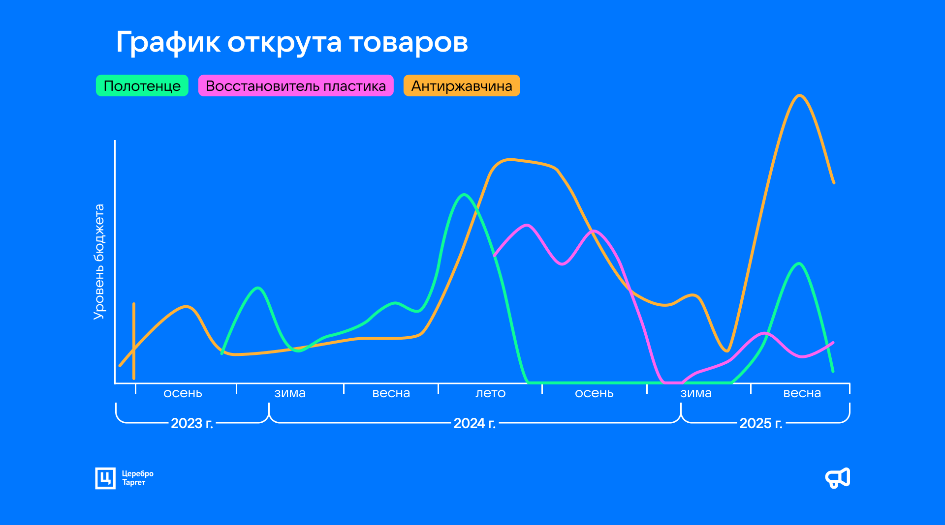 В этот период откручивали уже по 4-8 товаров — антиржавчину и полотенца стабильно. Вывели в открут восстановитель пластика, ситуативно запускали антибитум и очиститель стекол, регулярно запускали различные наборы для салона и колес.
