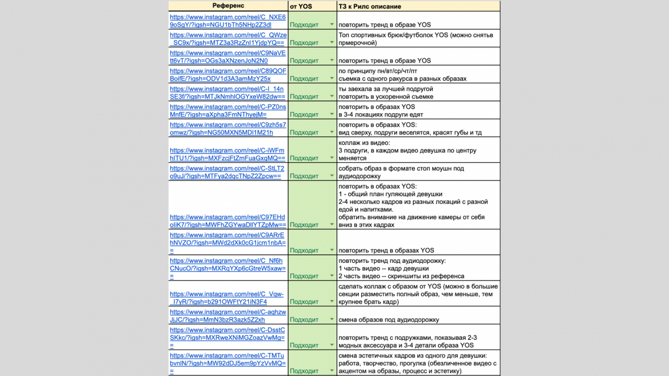 Референсы собирала наша команда, которая постоянно ищет актуальные ролики как зарубежом, так и на русскоязычном пространстве. Референсы же подбирали по принципу их новизны: важно, чтобы ролик был не старше 3-4 недель. Если сценарий видео старый и неактуальный — алгоритмы уже не будут выводить его в топ.
