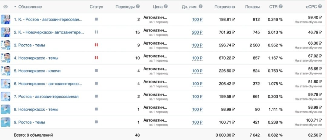 По настройкам лучше всего зашли тема родители и автозаинтересованная с CTR около 1,3%, но с дорогим кликом)) Визуал лучше зашёл с несколькими фотографиями.