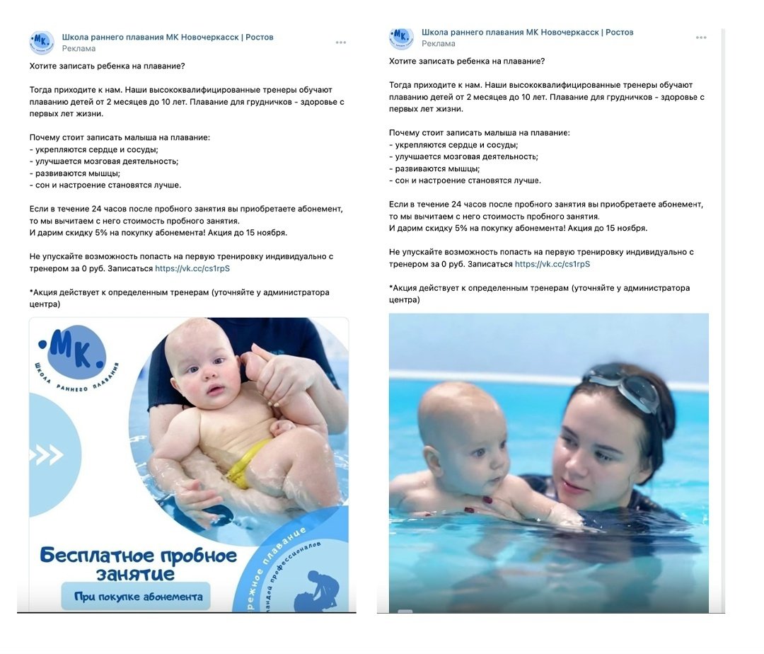 Далее приступила к сбору настроек. Собрала ключевые фразы «плавание для детей» итд, спарсила группы конкурентов и смежные группы. А потом в самом кабинете также запустила рекламу на тему родители и дети определенного возраста, автозаинтересованную аудиторию. В креативы добавила одну фотографию - несколько фотографий - макет - видео. Формат объявления - карусель, универсальная запись. Трафик сделала на сообщения.