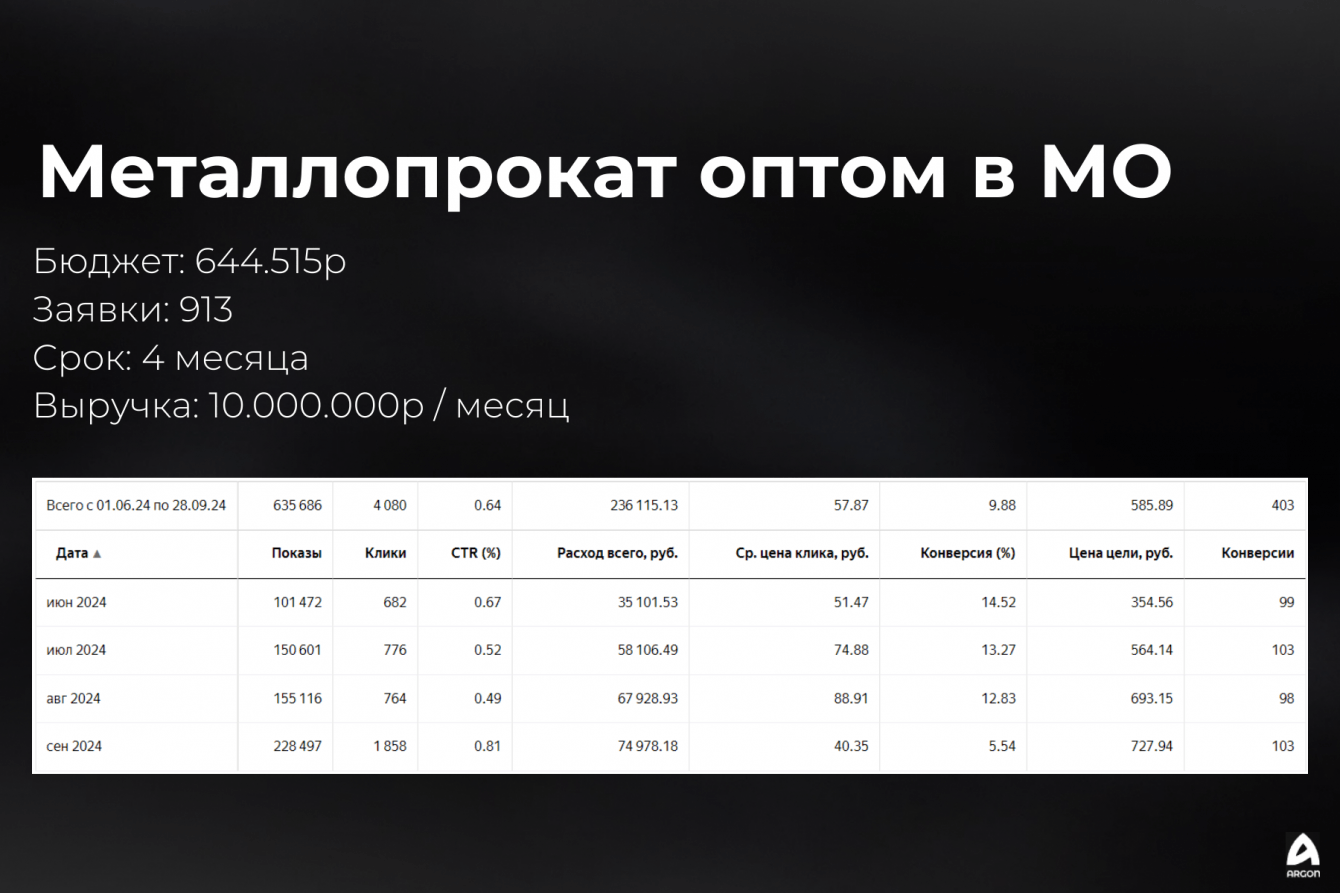 Ведут рекламу в поиске на горячие запросы (купить арматуру, метллопрокат оптом и т.д.) и в РСЯ на одностраничный сайт. На сайте закрывают в расчет стоимости
