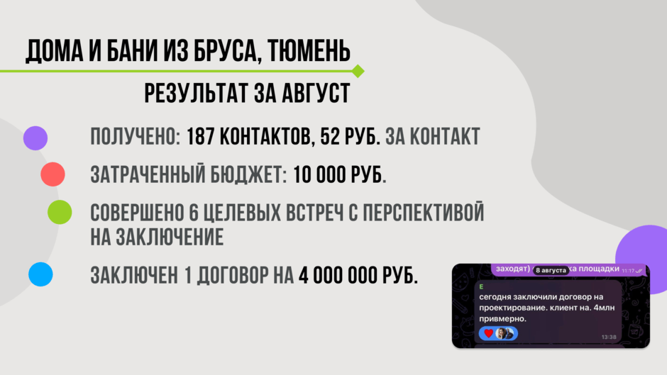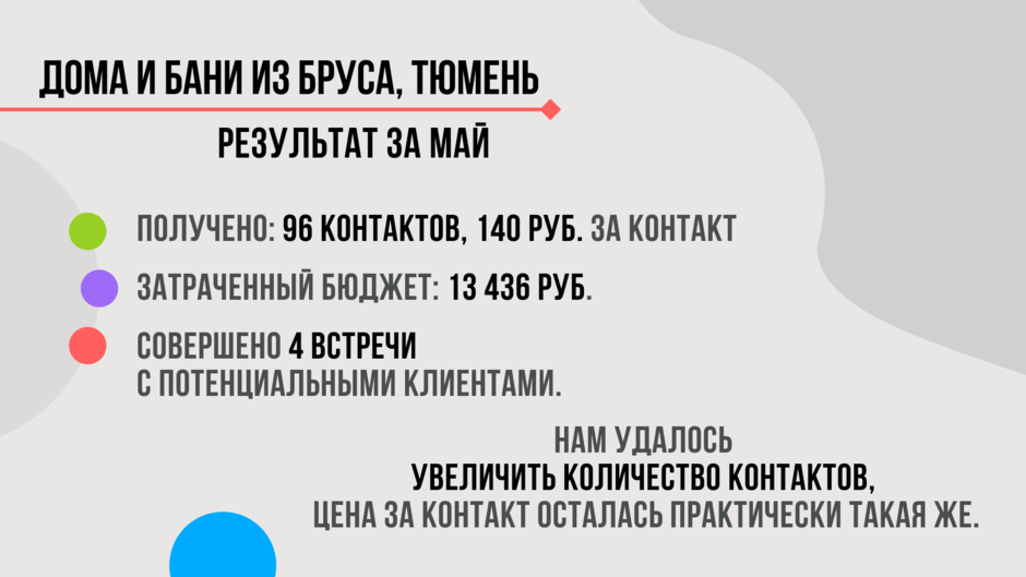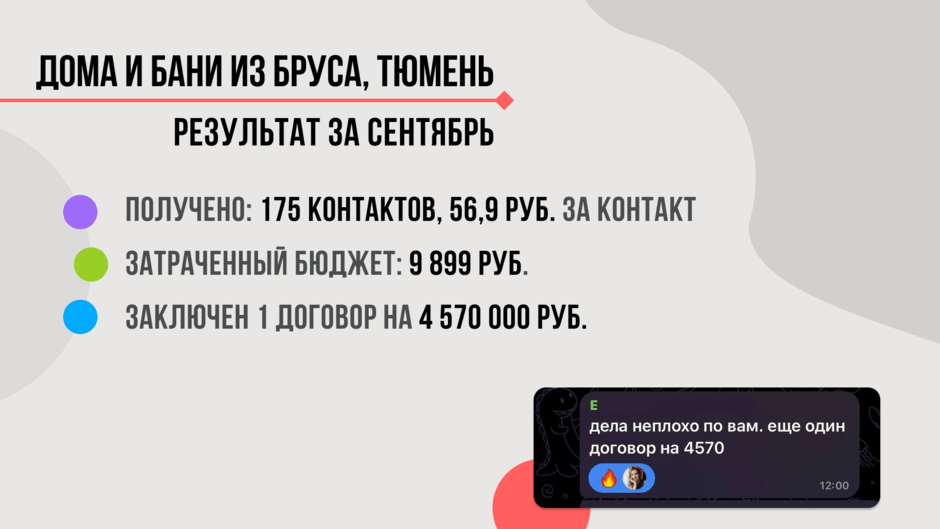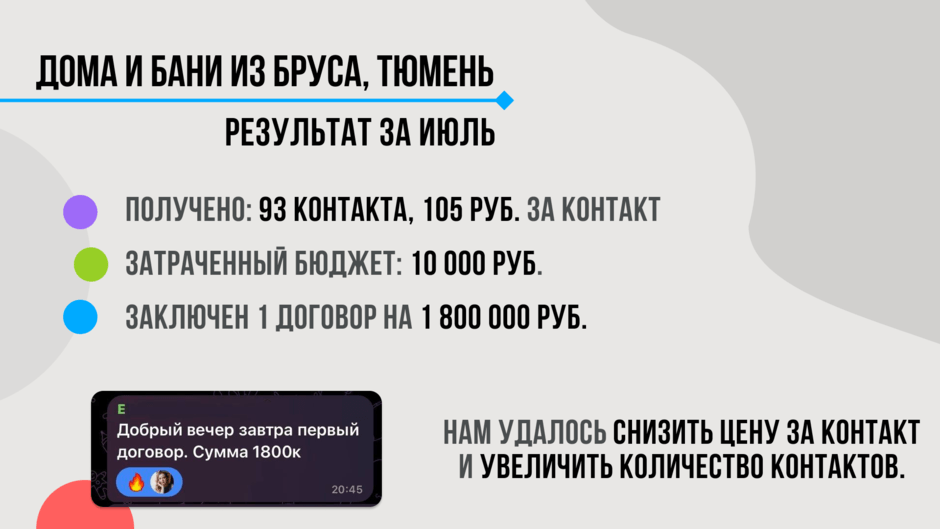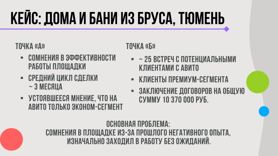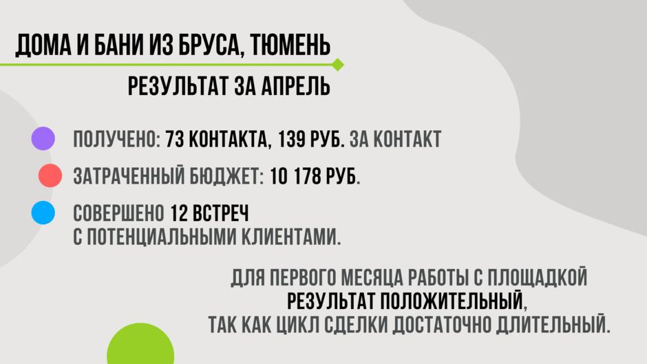 Заключён договор на 4 000 000 рублей. Это был второй договор по премиальному продукту (клееный брус — самая дорогая линейка) с Авито. Тем самым, нам удалось разрушить миф, что на данной площадке все ищут только самое дешевое.