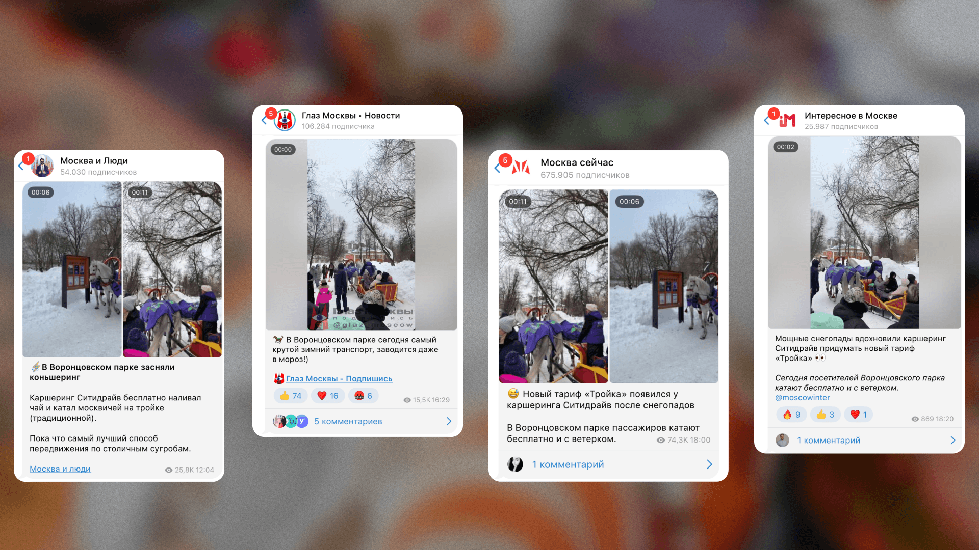 В результате «коньшеринг» быстро подхватили группы в Telegram и других медиа. Так, например, про бренд-активацию бесплатно рассказали крупные паблики «Моя Москва» (474 тыс. подписчиков), «Глаз Москвы» (108 тыс. подписчиков), «Москва и Люди» (66 тыс. подписчиков), moscow_all_zdes (53,9 тыс. подписчиков), moscow_today (55,5 тыс. подписчиков) и другие.