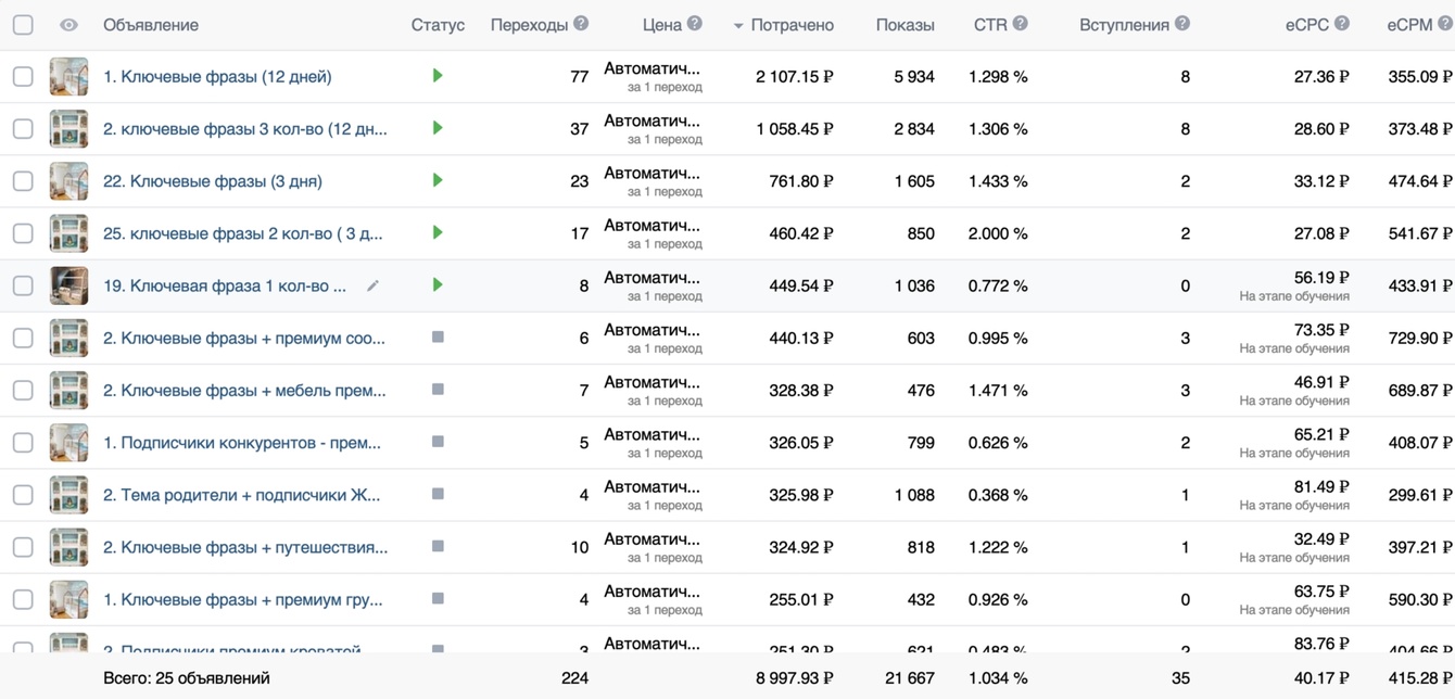 Запуск рекламы был в кабинете Реклама Вконтакте. Протестировала несколько форматов объявлений 4 фотографии, видео, макет с коротким и длинным текстом. С настройками на ключевые фразы за последний 12 дней, 3 дня «кровати детские», «купить кровать для ребенка» и другие фразы; на подписчиков конкурентов; на новых подписчиков групп по новостройкам Москва и Питер; на тему ремонт и родители. Но, к сожалению, была дорогая стоимость клика и сообщения.