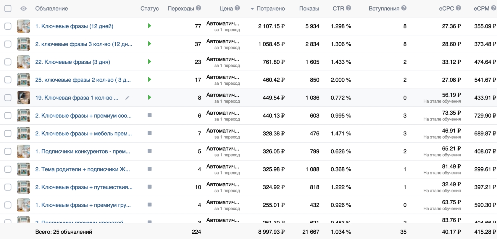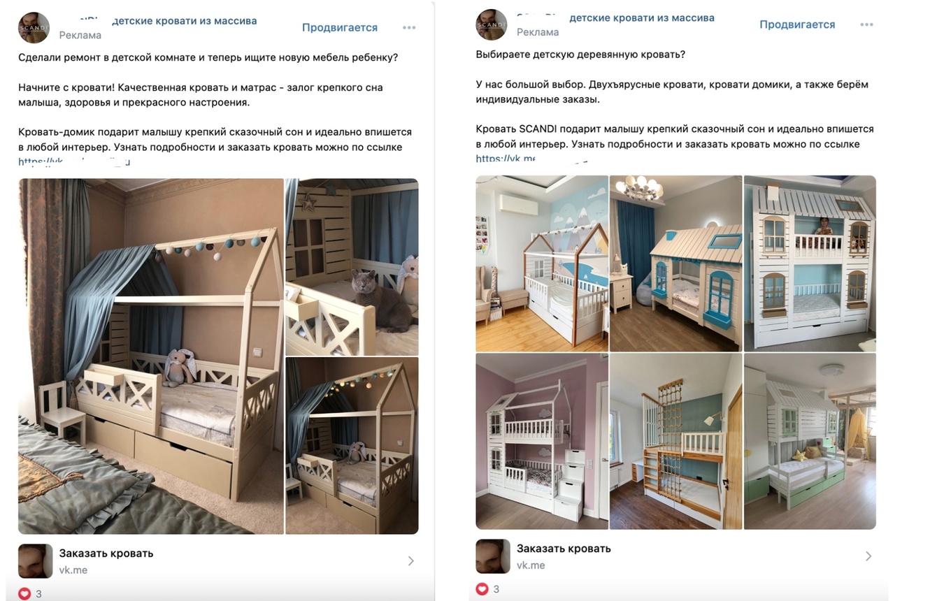 Запуск рекламы был в кабинете Реклама Вконтакте. Протестировала несколько форматов объявлений 4 фотографии, видео, макет с коротким и длинным текстом. С настройками на ключевые фразы за последний 12 дней, 3 дня «кровати детские», «купить кровать для ребенка» и другие фразы; на подписчиков конкурентов; на новых подписчиков групп по новостройкам Москва и Питер; на тему ремонт и родители. Но, к сожалению, была дорогая стоимость клика и сообщения.