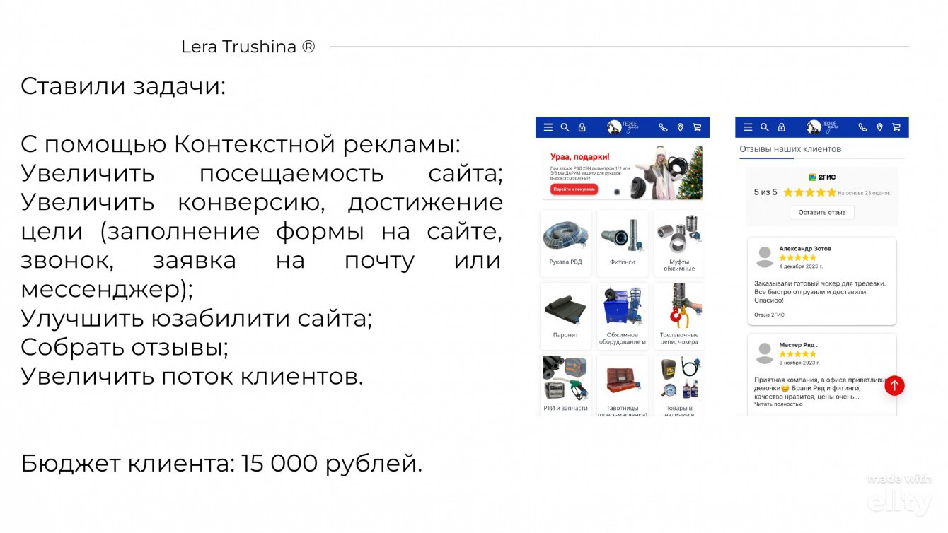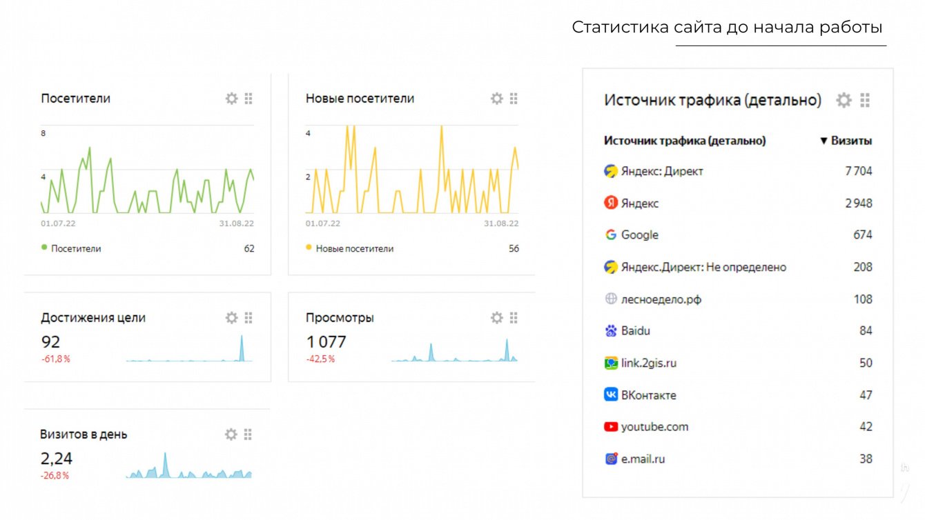 Ставили задачи: Увеличить посещаемость сайта, увеличить конверсию, юзабилити сайта, достижение цели (заполнение формы, звонок, заявка на почту), юзабилити сайта, собрать отзывы, увеличить поток клиентов.