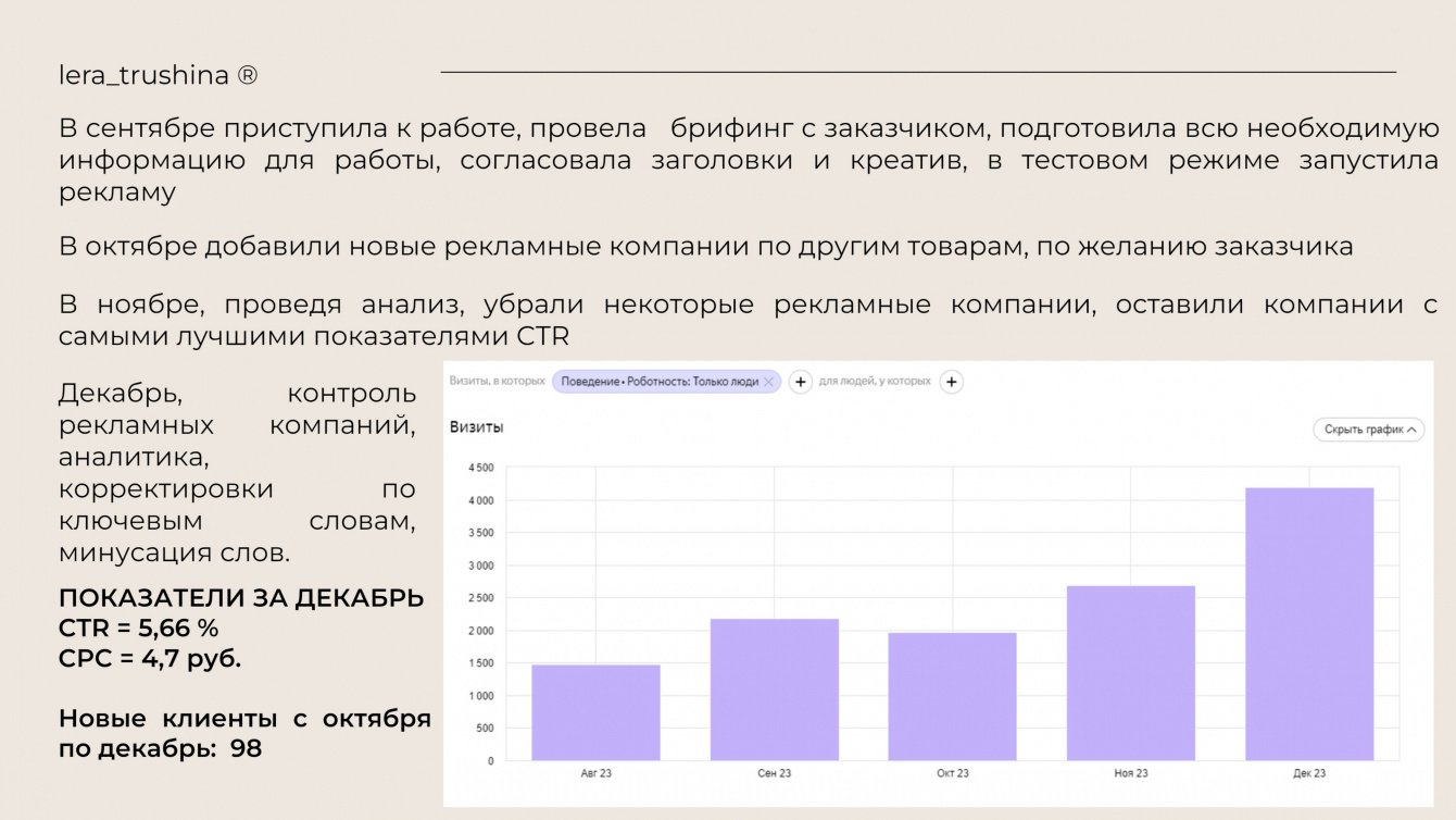 Мною были прописаны заголовки и созданы креативы, согласованы с клиентом, далее были запущены РК. Отчет по проделанной работе можно посмотреть в прикрепленных фото.