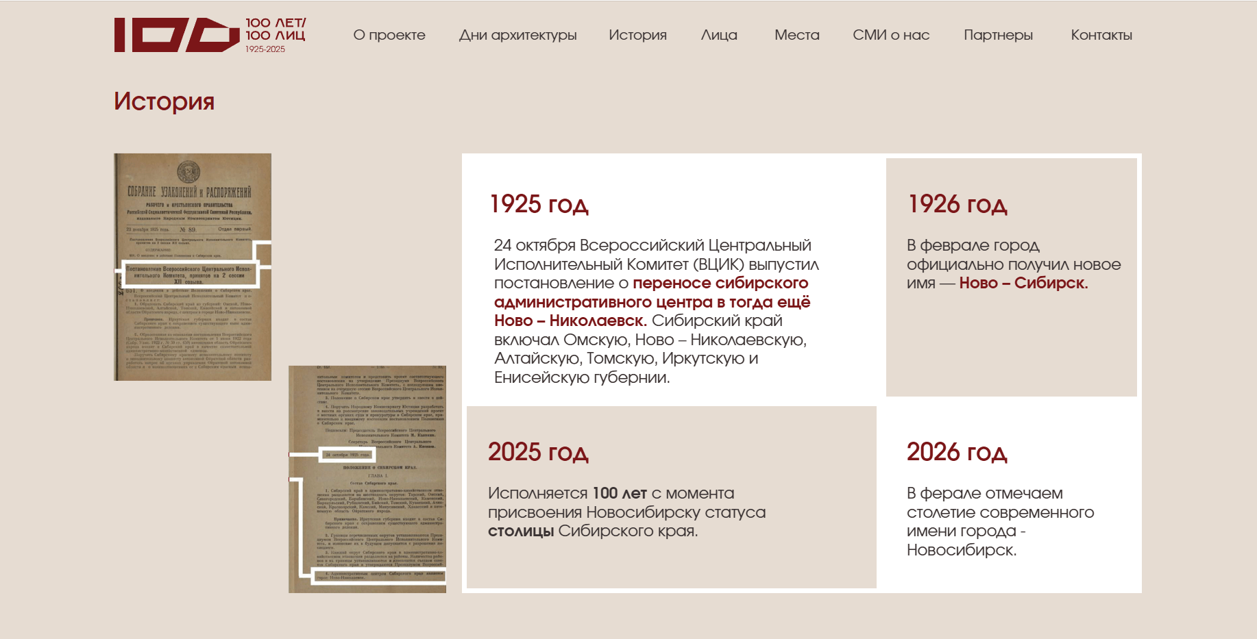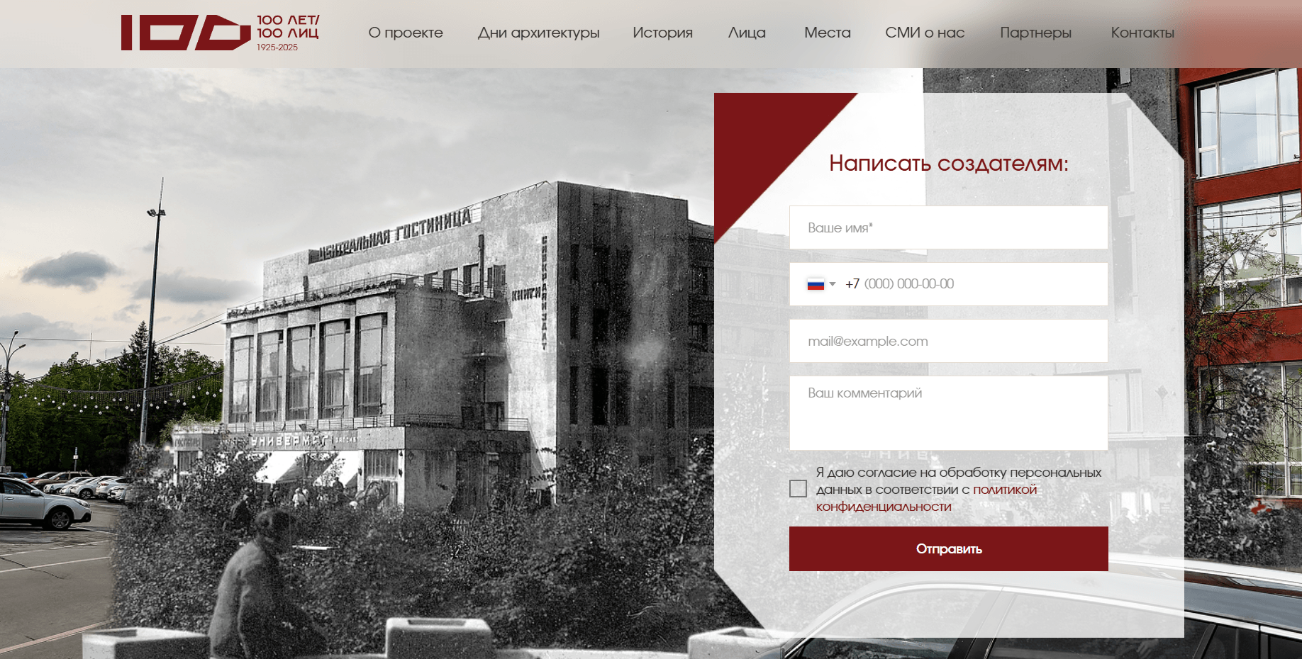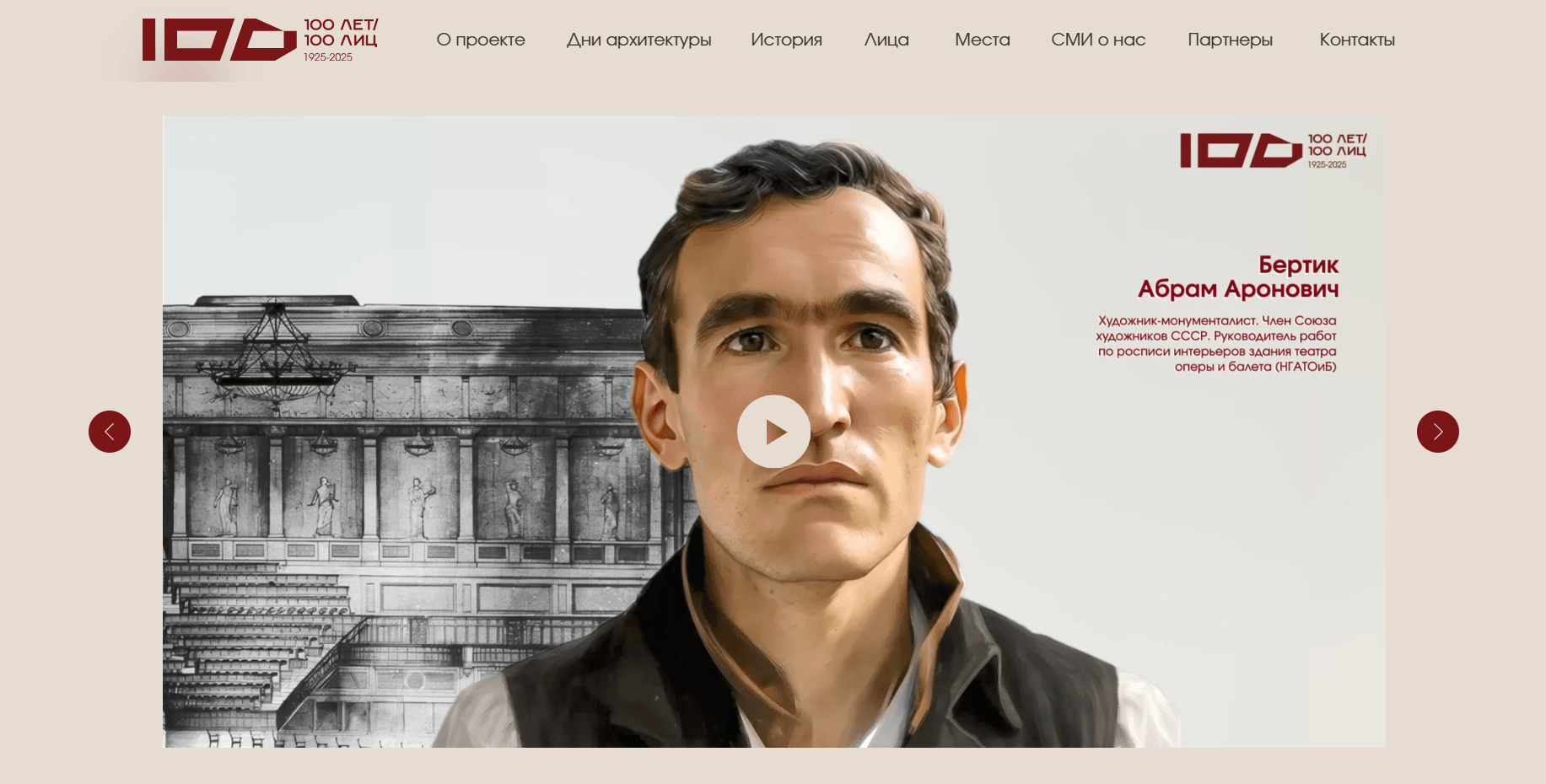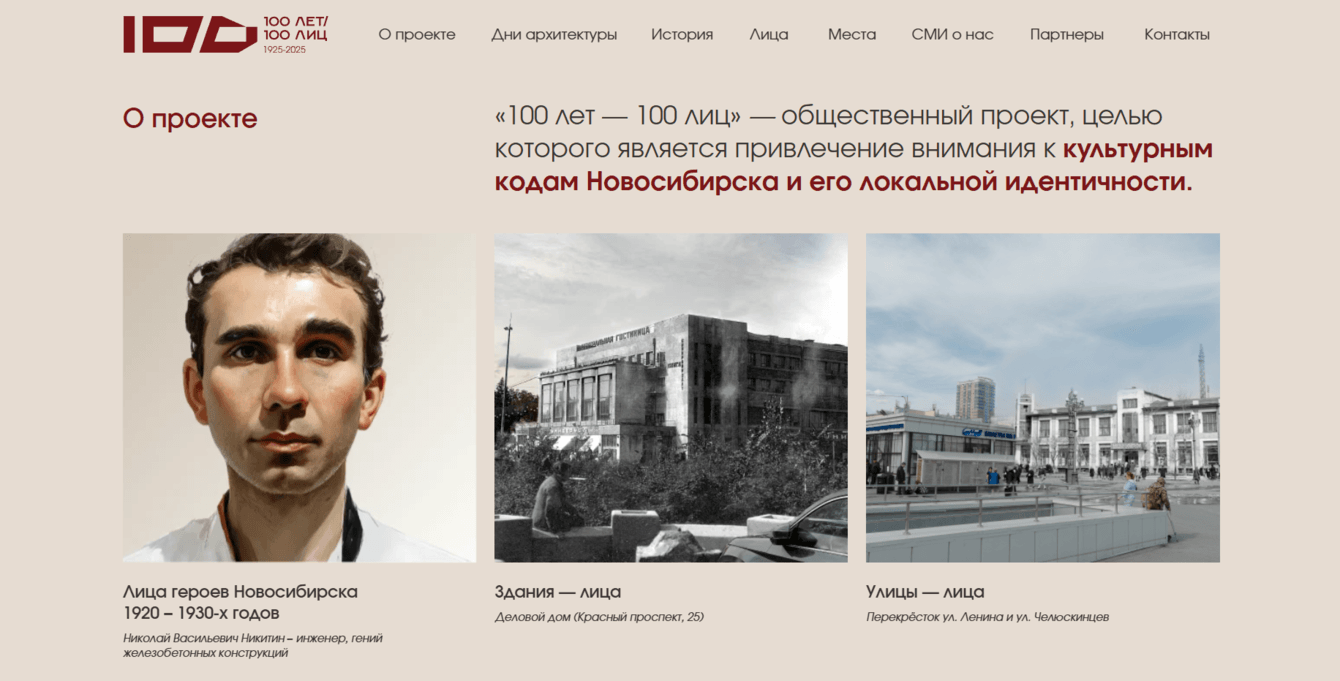 Создать сайт для общественного проекта «100 лет — 100 лиц», направленного на привлечение внимания к культурным кодам Новосибирска и укрепление локальной идентичности города. Основная цель — разработать онлайн-ресурс, который станет частью масштабной городской информационной кампании и визуально продолжит её стиль.