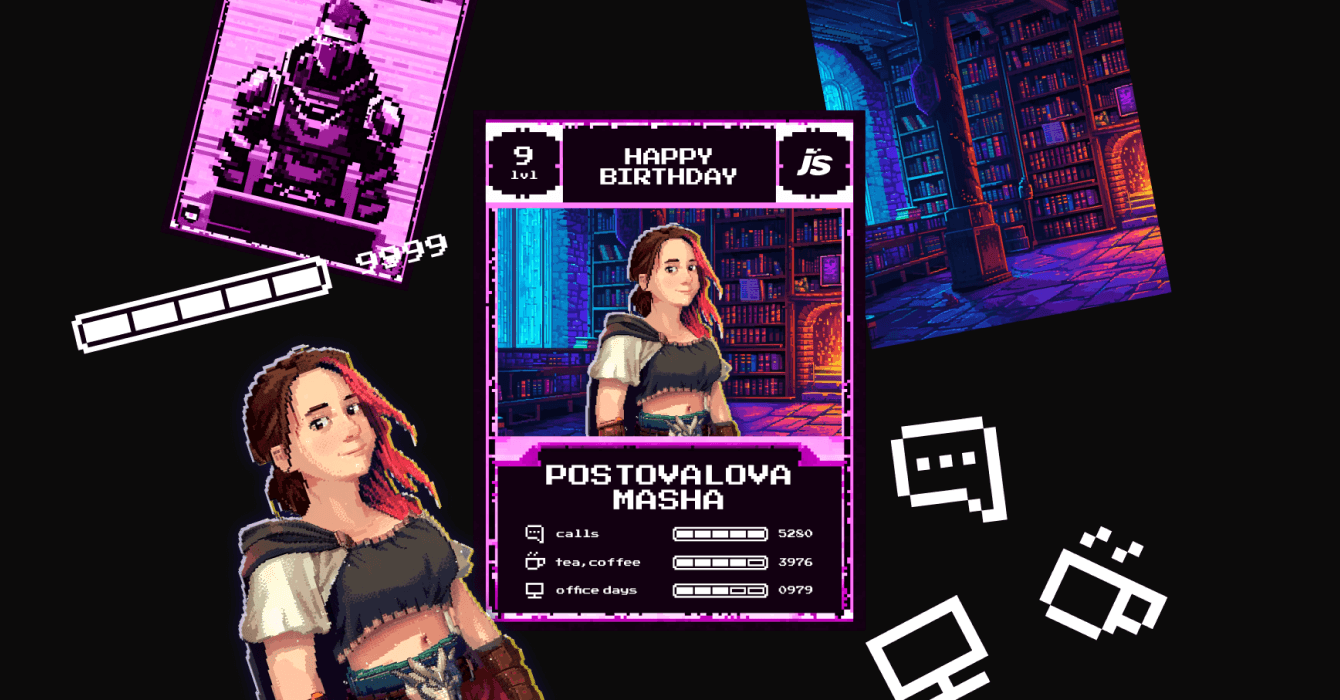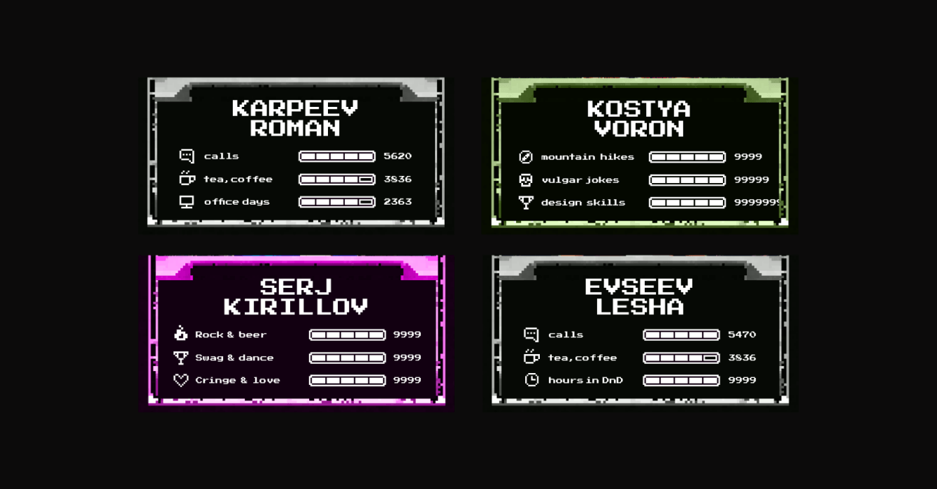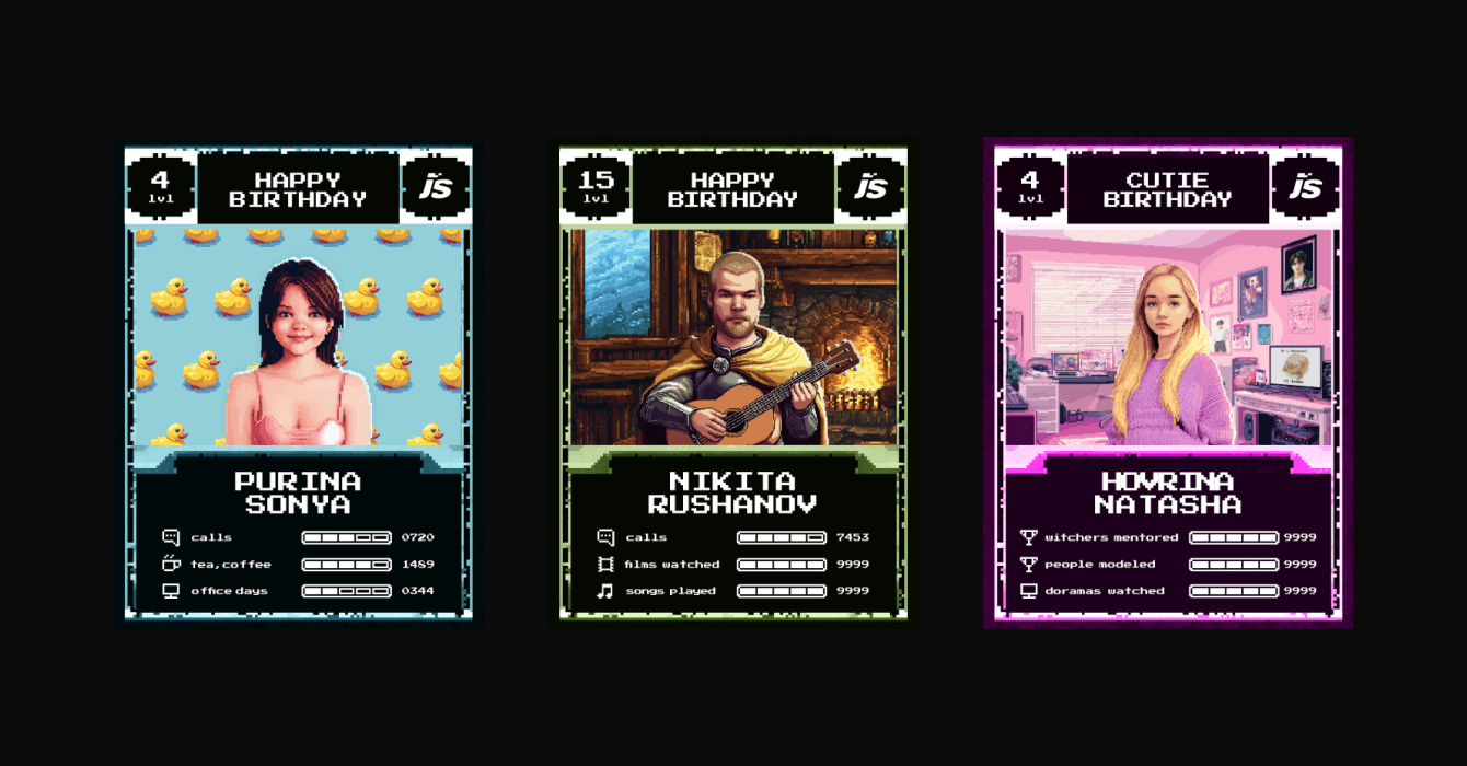 Каждый раз писать поздравления вручную — задача не из легких. Хотелось, чтобы это было не просто формальностью, а чем-то личным и запоминающимся. Так вместе с командой мы придумали карточки с характеристиками в игровом стиле — ведь у нас все так или иначе связаны с играми и ребята любят их.