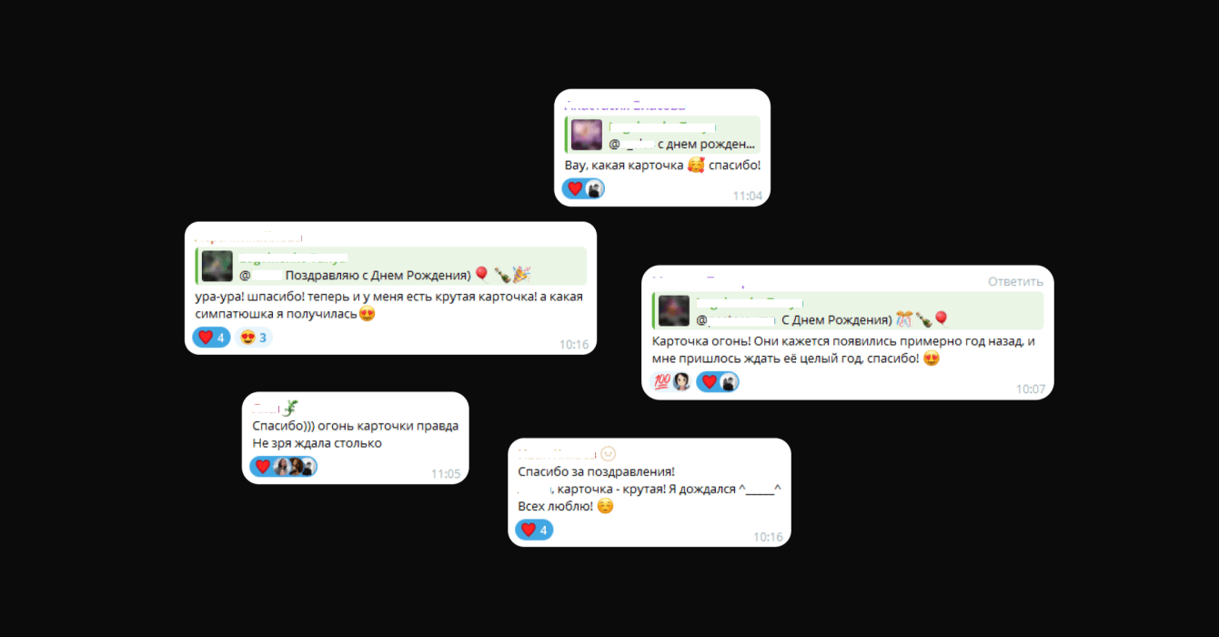 Самое приятное — получать фидбэк от ребят и знать, что все ждут своего дня рождения не только из-за поздравлений на созвонах и в офисе, но и потому, что получат долгожданную открытку. Не менее ценно узнавать что-то новое о коллегах в процессе создания карточек — например, что наша HR Таня любит уточек, Настя из VR-команды обожает мемы про лягушек, а Антон из Motion играет на укулеле.