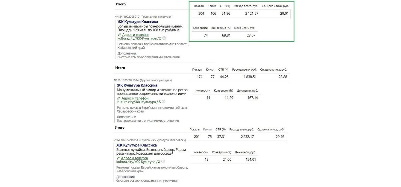 За время ведения рекламных кампаний для «ДА! ДЕВЕЛОПМЕНТ» мы протестировали более 200 комбинаций ключевых запросов, чтобы выявить лучшие и отсеять нерезультативные. К примеру, в кампании для таунхаус-квартала мы показывали рекламу в ответ на поисковые запросы: «купить таунхаус», «купить большую квартиру», «купить коттедж в Хабаровске», «купить дом в Хабаровске». Тесты показали, что часть поисковых запросов не привели к обращениям, и мы отказались от них, оставив в настройках наиболее конверсионные.