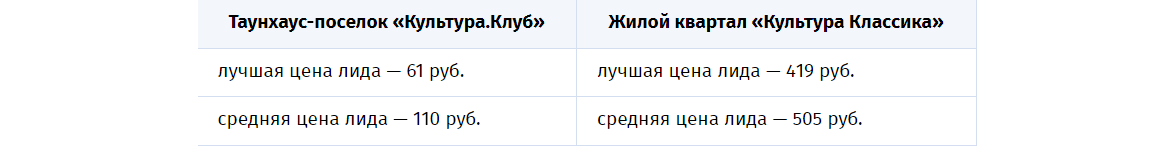Например, таунхаусы в «Культура. Клуб» — это недвижимость премиум-класса, рассчитанная на молодые семьи или пары. Чтобы привлечь нужную ЦА, мы корректировали ставки и оценивали результат: повышали ставки на платежеспособную аудиторию, на аудиторию 35+.