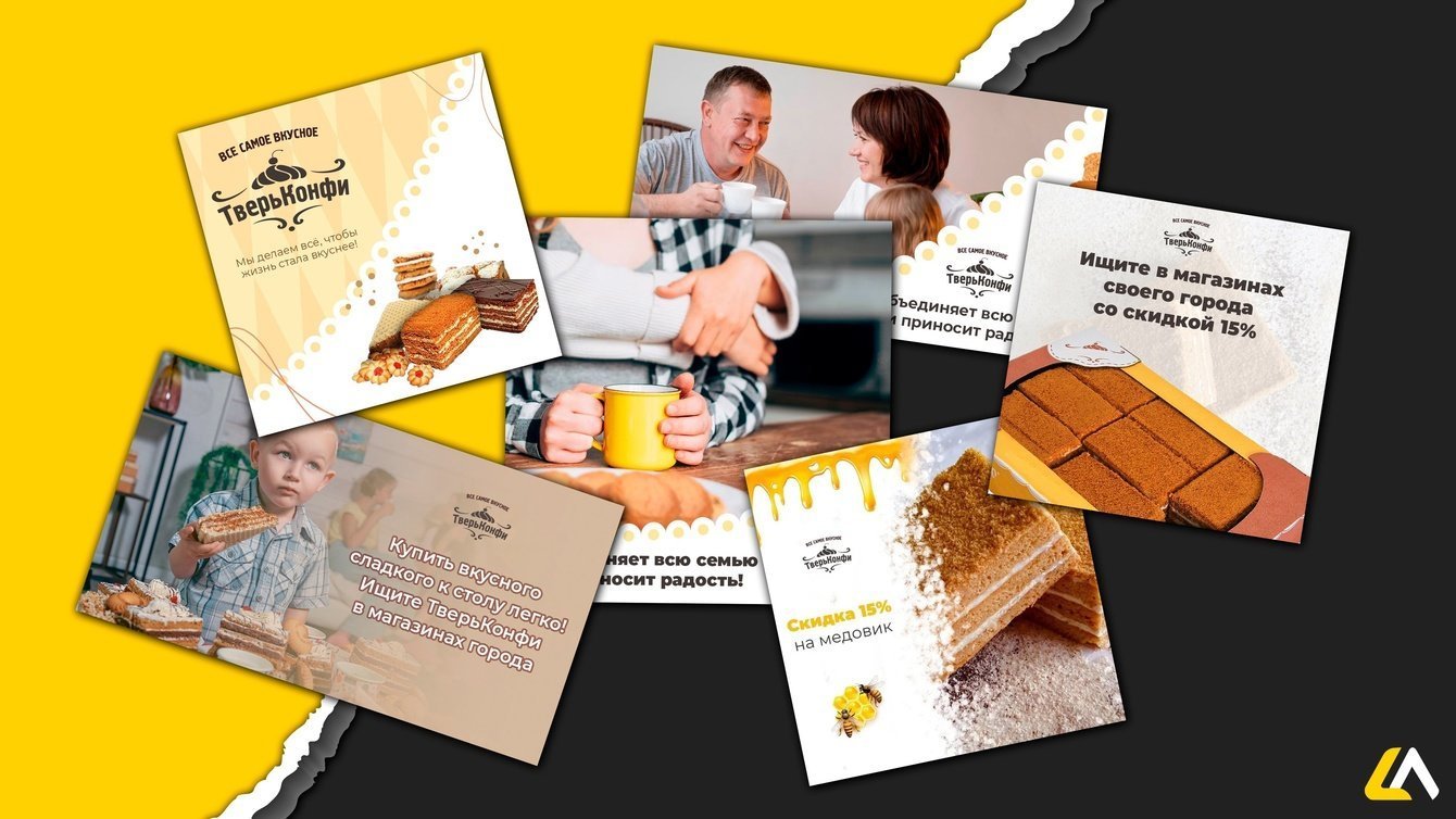 Были разработаны креативы для нескольких аудиторий. Для более старшего возраста использовались фотографии с семьей и детьми, для остальных — фотографии производимых сладостей.