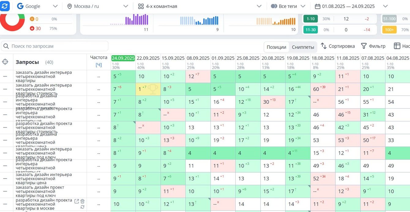 Клиент основал собственную дизайн-студию интерьеров и захотел получать дополнительные лиды через органическую выдачу Яндекс и Гугл. Задача дополнительно осложнялась тем что у клиента уже был сайт на Тильде.