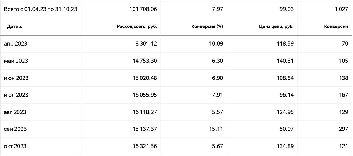 Получили положительные метрики на старте и постепенно стали наращивать бюджет с согласия клиента. За полгода Товарная кампания принесла нам 1027 целевых конверсий по 100 рублей за заявку.