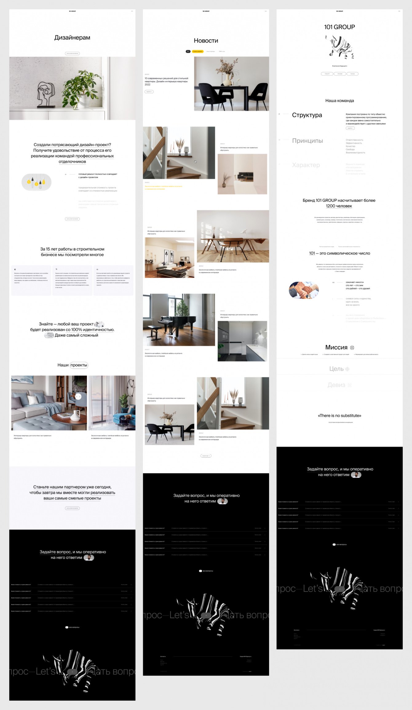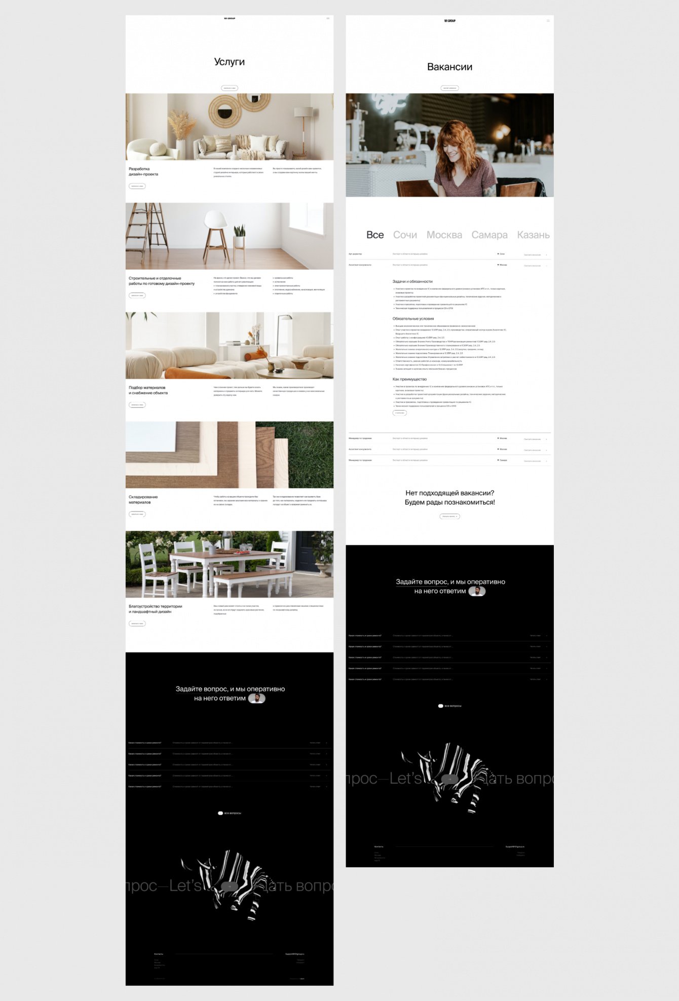 Главная страница – это презентация (WOW!) и позиционирование бренда. Выполнена в формате LP и содержит анонсы всех ключевых разделов сайта. Несмотря на количество информации и объемную структуру, все разделы сайта выполнены в едином стиле, с большим вниманием к деталям.