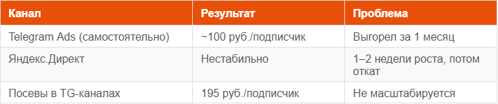 • Посевы в Telegram-каналах: цена подписчика 195 рублей, но процесс муторный и не масштабируемый.
