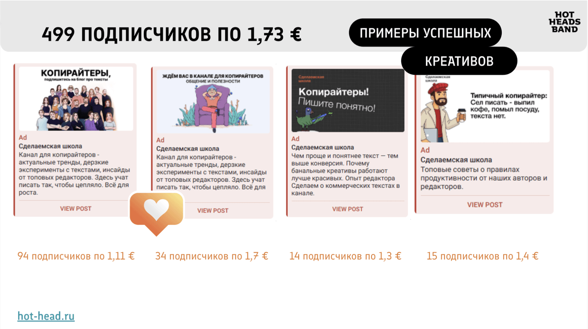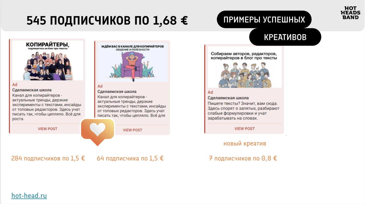 ▶ Образовательный проект «Сделаемская школа» пришёл в HotHeads Band с одной, казалось бы, несложной задачей: привлечь подписчиков в Telegram-канал по 200–250 рублей. Предыдущий опыт с Telegram Ads давал нестабильный результат — один работающий креатив быстро выгорал, а поиск нового занимал месяцы. За два отчётных периода агентству удалось не только выйти на плановую цену подписчика, но и выстроить систему, которая не выгорает.