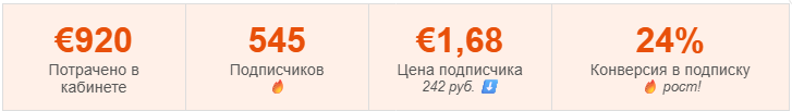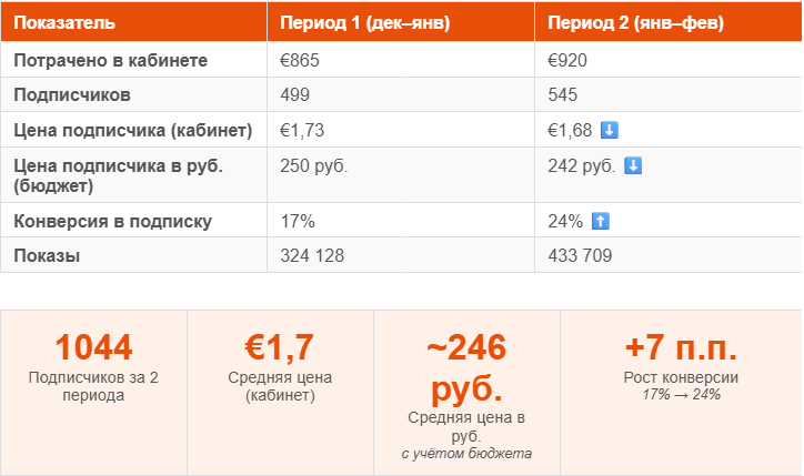 ▶ Ключевой показатель: конверсия в подписку выросла с 17% до 24% — это означает, что при примерно том же числе кликов подписчиков стало больше. Цена подписчика снизилась с 1,73 до 1,68 евро несмотря на рост объёмов. В рублях — 242 рубля с учётом рекламного бюджета (без агентского вознаграждения), что укладывается в KPI клиента.