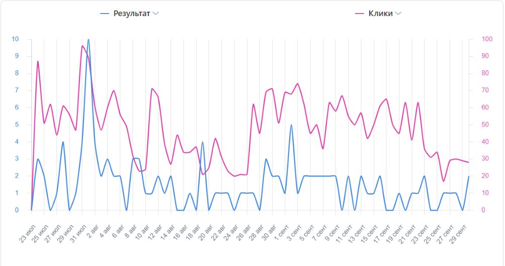 Уже со второго дня работы рекламных кампаний клиент начал получать заявки. Реклама крутилась чуть больше двух месяцев и весь этот период поток откликов на вакансии был стабильным. Вот как в динамике выглядело соотношение кликов и заявок в рекламном кабинете VK рекламы: