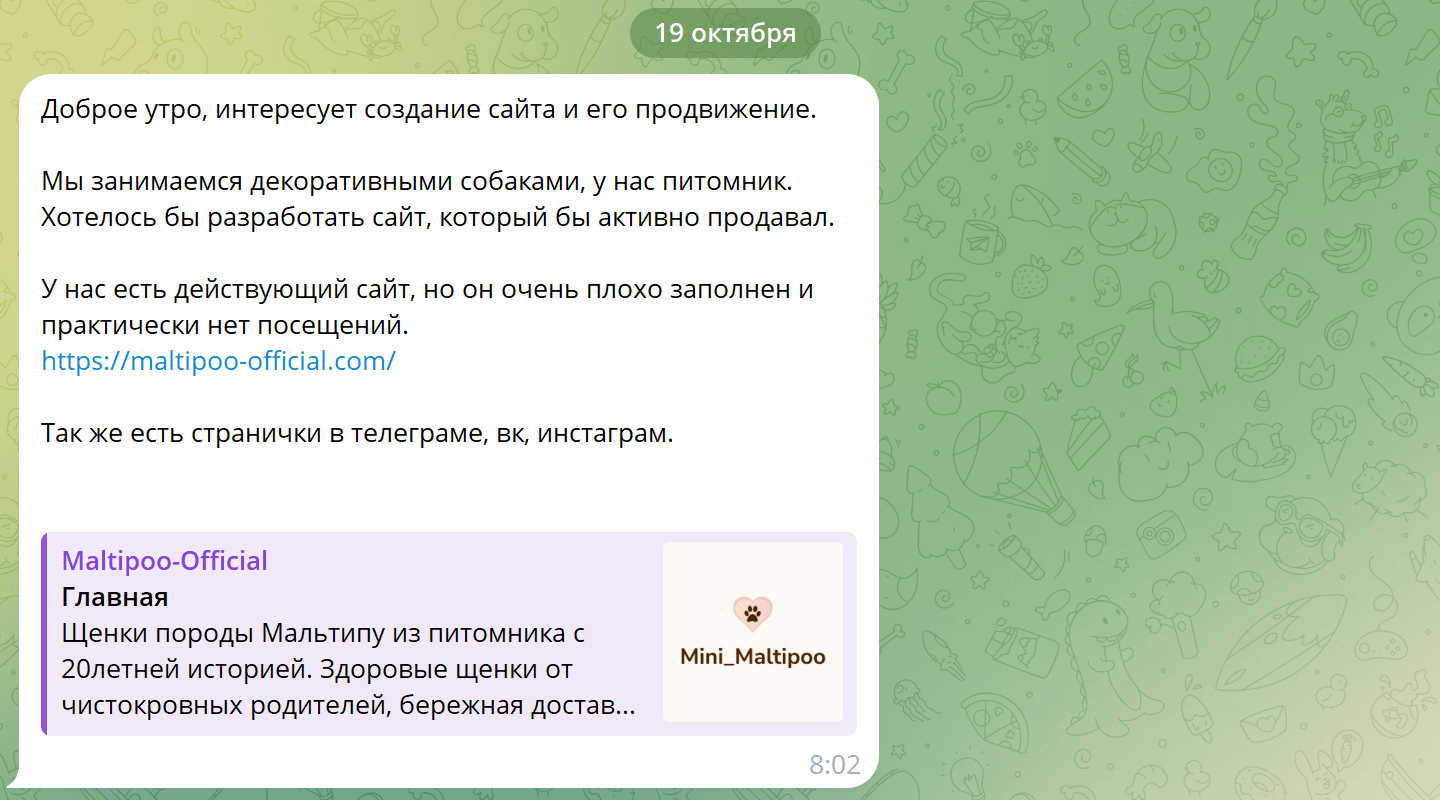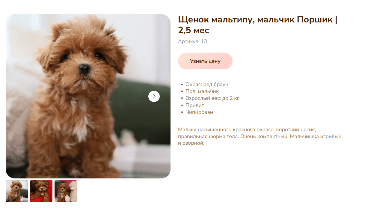 Осенью 2024 года ко мне в агентство обратилась заводчица породистых щенков мальтипу. Это очаровательные маленькие собаки, представляющие собой помесь мальтийской болонки и той-пуделя. Они умные и дружелюбные компаньоны, которые быстро становятся преданными друзьями своих хозяев.