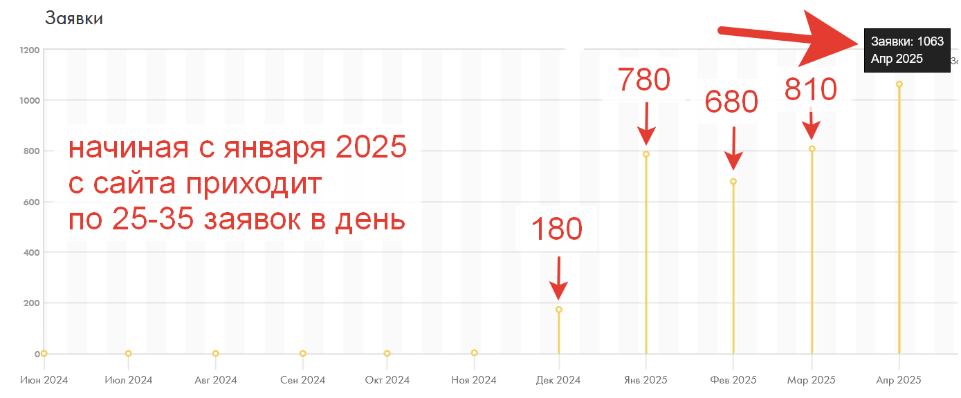 Благодаря комплексной работе над оптимизацией сайта и продвижению в поисковых системах, нам удалось получить 163 заявки уже в первые 2 недели после запуска сайта.Сейчас в среднем в месяц получаем 900 обращений из поисковых систем и 100 обращений с контекстной рекламы.