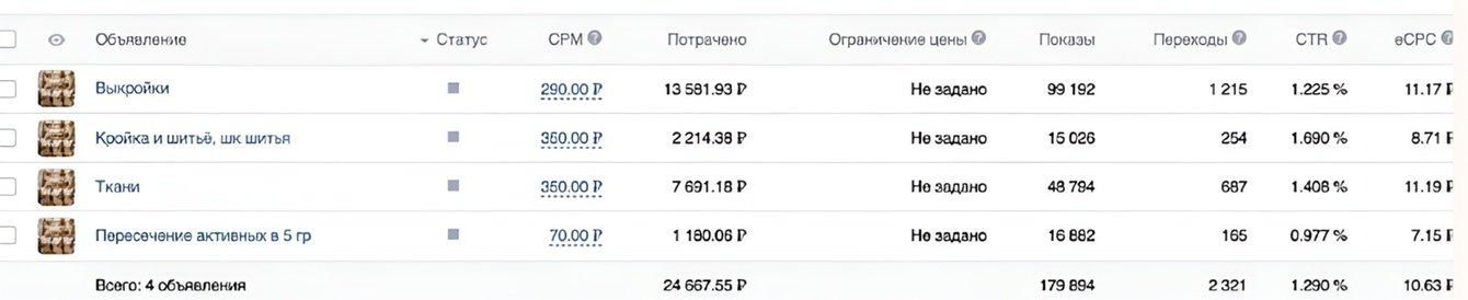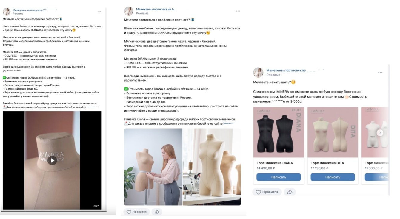 Было подготовлено несколько форматов «карусель», «универсальная запись», «запись с кнопкой» тексты с длинным описанием и короткие. Визуал - видео, макет, фотографии. Посадочную страницу выбрали на личные сообщения. С настройками на ключевые фразы «купить портновский манекен» итд, на активных подписчиков сообществ «Выкройка, шитьё» итд, на активных подписчиков конкурентов и также запускала ретаргет. A-B тестирование рекламных креативов длился месяц, затемприступила к оптимизации рекламы. Таким образом, за это время нашли наиболее эффективные рекламных связки.