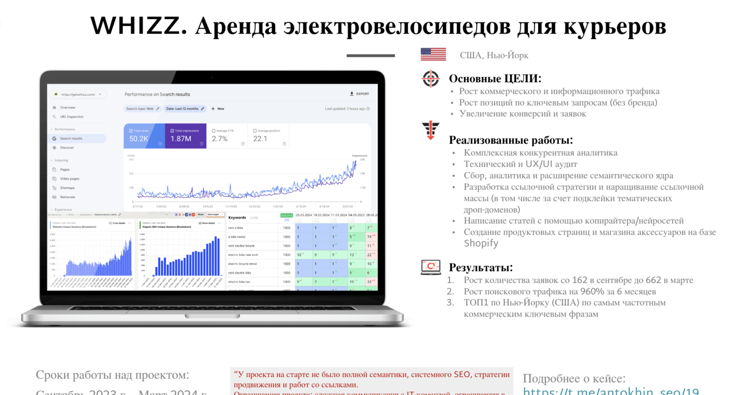 "Летом 2023 года мы занялись поиском подрядчика по SEO нашего сайта https://getwhizz.com. На момент начала нашего сотрудничества велись отдельные виды работ, но системности в действиях и выстроенной стратегии не было. Учитывая локальность проекта (на данный момент мы работаем только в NYC, но планируем расширяться) и высокую конкуренцию в нашей нише, мы понимали сложность вывода проекта на топовые позиции, и при выборе исполнителя руководствовались критериями готовности искать нестандартные подходы к задаче роста бизнеса и способности смотреть на это шире, чем только в разрезе объема привлекаемого трафика. SEO-специалист Андрей Антохин произвел впечатление именно такого специалиста, и, как показало дальнейшее сотрудничество, мы не ошиблись в своем выборе.” – CMO, Nikita Semin. Полная версия рекомендации по ссылке https://t.me/antokhin_seo/19
