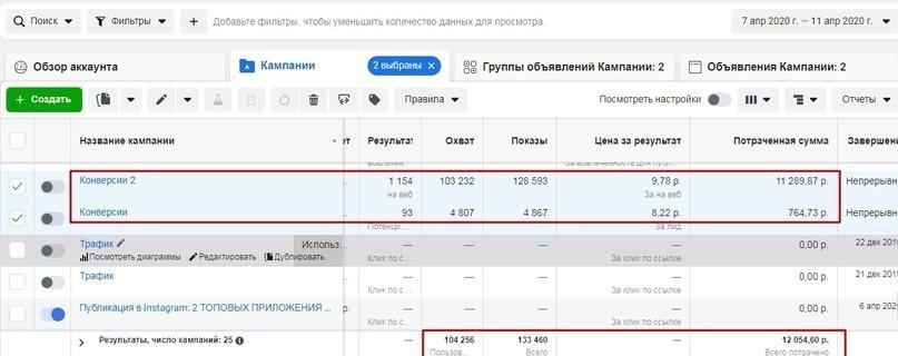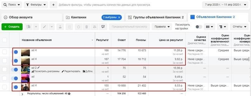 Весь тестовый период рекламная кампания отработала с 2 креативами и 2 видео, который работали на 10 аудиториях. Больше крео не добавляли, потому что на сбор лидов было всего 4 дня)