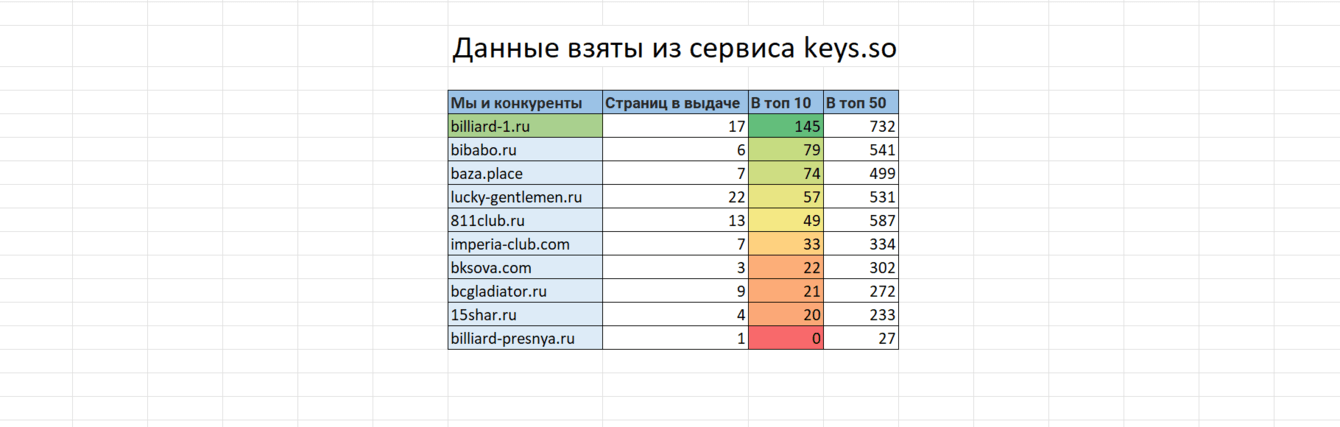 Ниже скрин из сервиса keys.so уже ПОСЛЕ проведенных нами работ. Из скрина видно наш клиент billard-1.ru имеет больше всего запросов в ТОП-10.