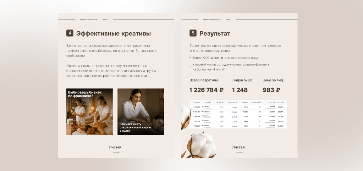 Более года успешного сотрудничества с клиентом принесло впечатляющие результаты: продажа франшизы за 2 миллиона рублей уже в первый месяц, вторая сделка на стадии подписания, более 1000 заявок и низкая стоимость лида (983 рубля). Продолжаем работать и достигать новых высот!