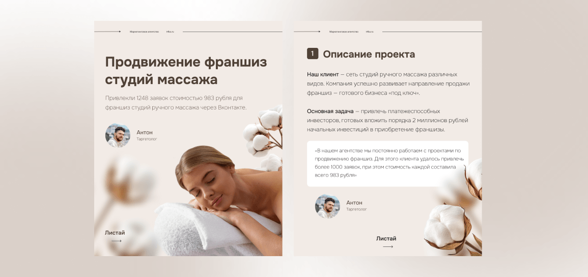 «Продвижение франшиз — моя основная специализация. Имею опыт работы с различными нишами, от массажных салонов до компаний по остеклению балконов. Узнать подробнее о других проектах можно здесь»